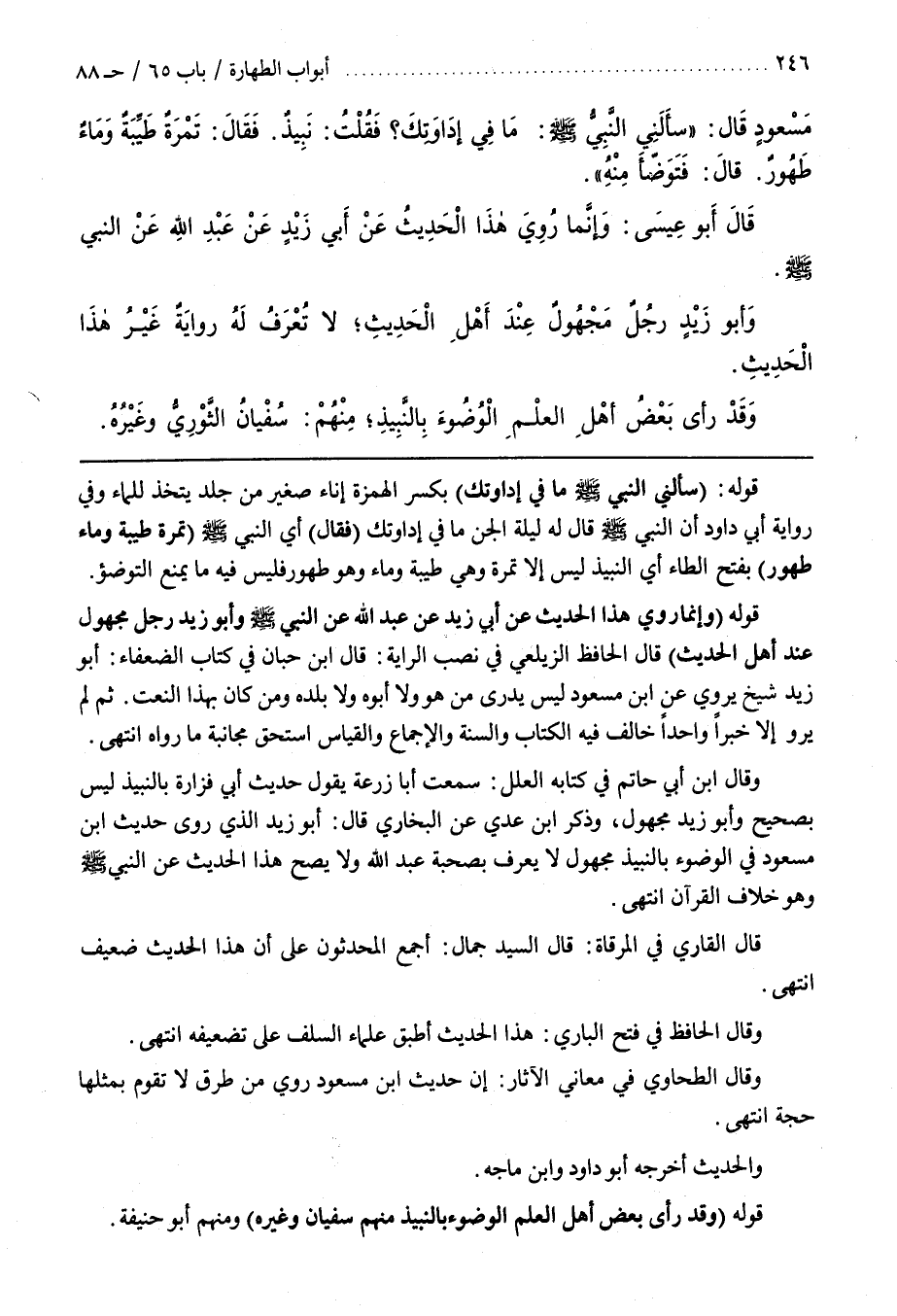 وقال بن أَبِي حَاتِمٍ فِي كِتَابِهِ الْعِلَلِ سَمِعْتُ أَبَا زُرْعَةَ يَقُولُ حَدِيثُ أَبِي فَزَارَةَ بِالنَّبِيذِ لَيْسَ بصحيح وأبو زيد مجهول وذكر بن عَدِيٍّ عَنِ الْبُخَارِيِّ قَالَ أَبُو زَيْدٍ الَّذِي روى حديث بن مَسْعُودٍ فِي الْوُضُوءِ بِالنَّبِيذِ مَجْهُولٌ لَا يُعْرَفُ بِصُحْبَةِ عَبْدِ اللَّهِ وَلَا يَصِحُّ هَذَا الْحَدِيثُ عَنِ النَّبِيِّ صَلَّى اللَّهُ عَلَيْهِ وَسَلَّمَ وَهُوَ خلاف القرآن انتهى