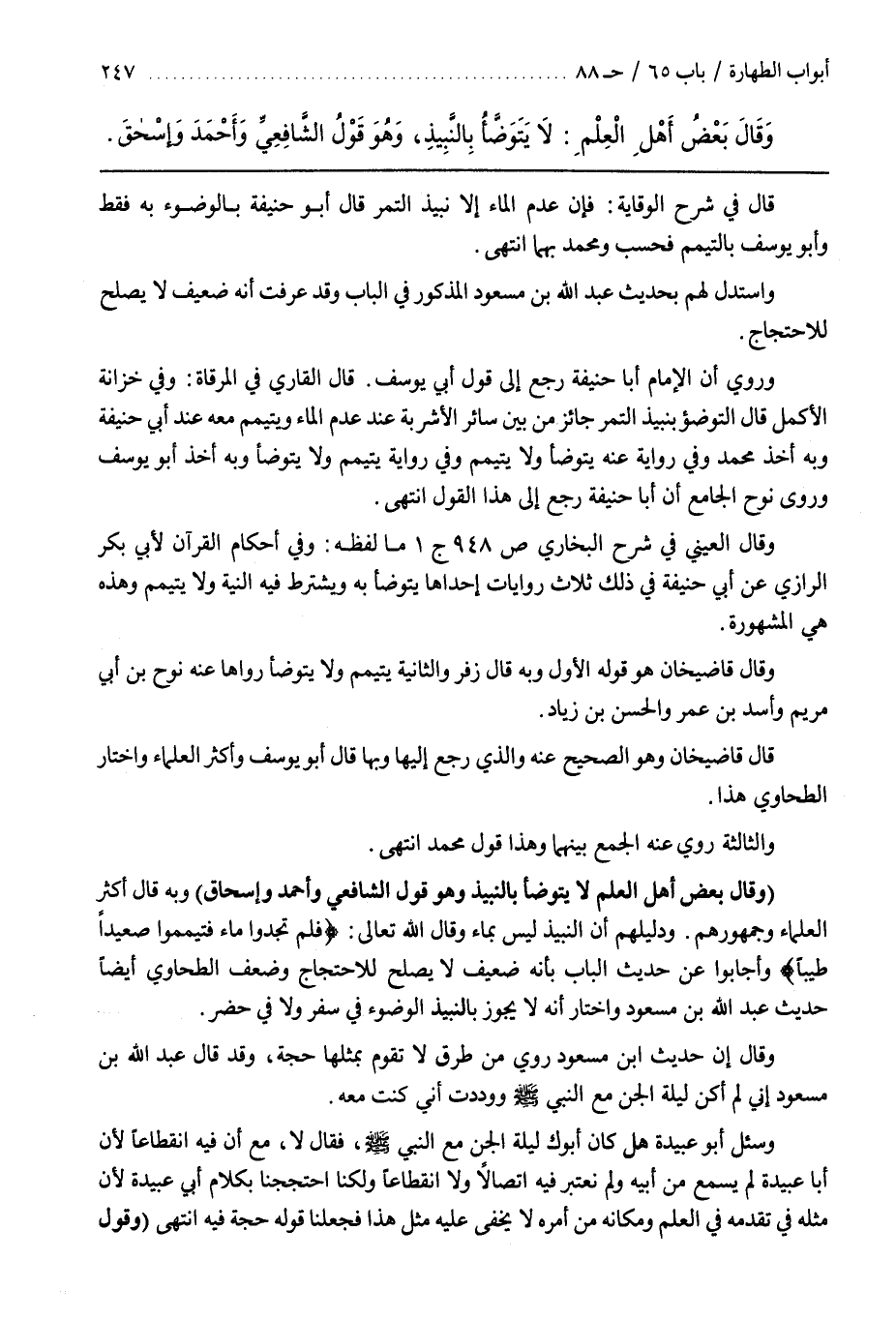 قال القارىء فِي الْمِرْقَاةِ وَفِي خِزَانَةِ الْأَكْمَلِ قَالَ التَّوَضُّؤُ بِنَبِيذِ التَّمْرِ جَائِزٌ مِنْ بَيْنِ سَائِرِ الْأَشْرِبَةِ عِنْدَ عَدَمِ الْمَاءِ وَيَتَيَمَّمُ مَعَهُ عِنْدَ أَبِي حَنِيفَةَ وَبِهِ أَخَذَ مُحَمَّدٌ وَفِي رِوَايَةٍ عَنْهُ يَتَوَضَّأُ وَلَا يَتَيَمَّمُ وَفِي رِوَايَةٍ يَتَيَمَّمُ وَلَا يَتَوَضَّأُ وَبِهِ أَخَذَ أَبُو يُوسُفَ وَرَوَى نُوحٌ الْجَامِعُ أَنَّ أَبَا حَنِيفَةَ رَجَعَ إِلَى هَذَا الْقَوْلِ انْتَهَى