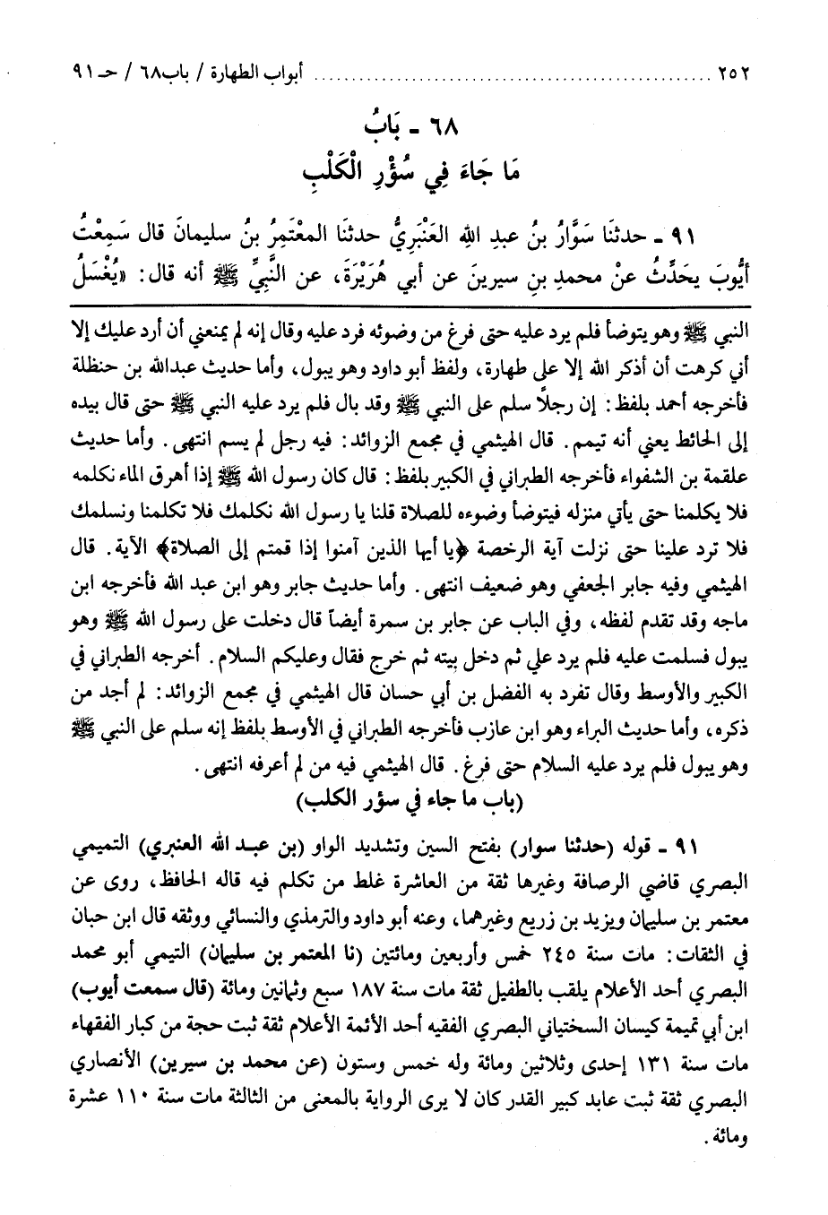 [91] قَوْلُهُ (حَدَّثَنَا سَوَّارُ) بِفَتْحِ السِّينِ وَتَشْدِيدِ الْوَاوِ (بْنُ عَبْدِ اللَّهِ الْعَنْبَرِيُّ) التَّمِيمِيُّ الْبَصْرِيُّ قَاضِي الرُّصَافَةِ وَغَيْرِهَا ثِقَةٌ مِنَ الْعَاشِرَةِ غَلِطَ مَنْ تَكَلَّمَ فِيهِ قَالَهُ الْحَافِظُ رَوَى عَنْ مُعْتَمِرِ بْنِ سُلَيْمَانَ وَيَزِيدَ بْنِ زُرَيْعٍ وَغَيْرِهِمَا وَعَنْهُ أبو داود والترمذي والنسائي ووثقه قال بن حِبَّانَ فِي الثِّقَاتِ مَاتَ سَنَةَ 543 خَمْسٍ وَأَرْبَعِينَ وَمِائَتَيْنِ (نَا الْمُعْتَمِرُ بْنُ سُلَيْمَانَ) التَّيْمِيُّ أَبُو مُحَمَّدٍ الْبَصْرِيُّ أَحَدُ الْأَعْلَامِ يُلَقَّبُ بِالطُّفَيْلِ ثِقَةٌ مَاتَ سَنَةَ 781 سَبْعٍ وَثَمَانِينَ وَمِائَةٍ (قَالَ سَمِعْتُ أيوب) بن أَبِي تَمِيمَةَ كَيْسَانَ السِّخْتِيَانِيَّ الْبَصْرِيَّ الْفَقِيهَ أَحَدَ الْأَئِمَّةِ الْأَعْلَامِ ثِقَةٌ ثَبْتٌ حُجَّةٌ مِنْ كِبَارِ الْفُقَهَاءِ مَاتَ سَنَةَ 131 إِحْدَى وَثَلَاثِينَ وَمِائَةٍ وَلَهُ خَمْسٌ وَسِتُّونَ عَنْ مُحَمَّدِ بْنِ سِيرِينَ الْأَنْصَارِيِّ البصري ثقة ثبت عابد كبير القدر كان لا يرى الرواية بالمعنى من الثالثة مات سَنَةَ 110 عَشَرَةَ وَمِائَةٍ