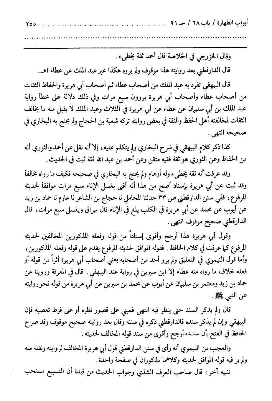 وَقَدْ عَرَفْتَ أَنَّهُ ثقة يخطىء وَلَهُ أَوْهَامٌ وَلَمْ يَحْتَجَّ بِهِ الْبُخَارِيُّ فِي صَحِيحِهِ فَكَيْفَ مَا رَوَاهُ مُخَالِفًا وَقَدْ ثَبَتَ عَنْ أَبِي هُرَيْرَةَ بِإِسْنَادٍ أَصَحَّ مِنْ هَذَا أَنَّهُ أَفْتَى بِغَسْلِ الْإِنَاءِ سَبْعَ مَرَّاتٍ مُوَافِقًا لِحَدِيثِهِ الْمَرْفُوعِ فَفِي سُنَنِ الدَّارَقُطْنِيِّ ص 33 حَدَّثَنَا الْمَحَامِلِيُّ نَا حَجَّاجُ بْنُ الشَّاعِرِ نَا عَارِمٌ نَا حَمَّادُ بْنُ زَيْدٍ عَنْ أَيُّوبَ عَنْ مُحَمَّدٍ عَنْ أَبِي هُرَيْرَةَ فِي الْكَلْبِ يَلَغُ فِي الْإِنَاءِ قَالَ يُهْرَاقُ وَيُغْسَلُ سَبْعَ مَرَّاتٍ قَالَ الدَّارَقُطْنِيُّ صَحِيحٌ مَوْقُوفٌ انْتَهَى