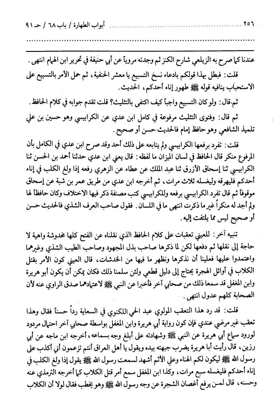 قُلْتُ تَفَرَّدَ بِرَفْعِهَا الْكَرَابِيسِيُّ وَلَمْ يتابعه على ذلك أحد وقد صرح بن عَدِيٍّ فِي الْكَامِلِ بِأَنَّ الْمَرْفُوعَ مُنْكَرٌ قَالَ الْحَافِظُ فِي لِسَانِ الْمِيزَانِ مَا لَفْظُهُ قَالَ يعني بن عَدِيٍّ حَدَّثَنَا أَحْمَدُ بْنُ الْحَسَنِ ثَنَا الْكَرَابِيسِيُّ ثَنَا إِسْحَاقُ الْأَزْرَقُ ثَنَا عَبْدُ الْمَلِكِ عَنْ عَطَاءٍ عَنِ الزُّهْرِيِّ رَفَعَهُ إِذَا وَلَغَ الْكَلْبُ فِي إِنَاءِ أَحَدِكُمْ فَلْيُهْرِقْهُ وَلْيَغْسِلْهُ ثَلَاثَ مَرَّاتٍ ثم أخرجه بن عَدِيٍّ مِنْ طَرِيقِ عُمَرَ بْنِ شَبَّةَ عَنْ إِسْحَاقَ مَوْقُوفًا ثُمَّ قَالَ تَفَرَّدَ الْكَرَابِيسِيُّ بِرَفْعِهِ وَلِلْكَرَابِيسِيِّ كُتُبٌ مُصَنَّفَةٌ ذَكَرَ فِيهَا الِاخْتِلَافَ وَكَانَ حَافِظًا لَهَا وَلَمْ أَجِدْ لَهُ مُنْكَرًا غَيْرَ مَا ذَكَرْتُ انْتَهَى مَا فِي اللِّسَانِ فَقَوْلُ صَاحِبِ الْعَرْفِ الشَّذِيِّ فَالْحَدِيثُ حَسَنٌ أَوْ صَحِيحٌ لَيْسَ مِمَّا يُلْتَفَتُ إِلَيْهِ تَنْبِيهٌ آخَرُ لِلْعَيْنِيِّ تَعَقُّبَاتٌ عَلَى كَلَامِ الْحَافِظِ الَّذِي نَقَلْنَاهُ عَنِ الْفَتْحِ كُلُّهَا مَخْدُوشَةٌ وَاهِيَةٌ لَا حَاجَةَ إِلَى نَقْلِهَا ثُمَّ دَفْعِهَا لَكِنْ لَمَّا ذَكَرَهَا صَاحِبُ بَذْلِ الْمَجْهُودِ وَصَاحِبُ الطِّيبِ الشَّذِيِّ وَغَيْرُهُمَا وَاعْتَمَدُوا عَلَيْهَا فَعَلَيْنَا أَنْ نَذْكُرَهَا وَنُظْهِرَ مَا فِيهَا مِنَ الْخَدَشَاتِ قَالَ الْعَيْنِيُّ كَوْنُ الْأَمْرِ بِقَتْلِ الْكِلَابِ فِي أَوَائِلِ الْهِجْرَةِ يَحْتَاجُ إِلَى دَلِيلٍ قَطْعِيٍّ وَلَئِنْ سَلَّمْنَا ذَلِكَ فَكَانَ يُمْكِنُ أَنْ يكون أبو هريرة وبن الْمُغَفَّلِ قَدْ سَمِعَا ذَلِكَ مِنْ صَحَابِيٍّ آخَرَ فَأَخْبَرَا عَنِ النَّبِيِّ صَلَّى اللَّهُ عَلَيْهِ وَسَلَّمَ لِاعْتِمَادِهِمَا صِدْقَ الرَّاوِي عَنْهُ لِأَنَّ الصَّحَابَةَ كُلَّهُمْ عُدُولٌ انْتَهَى قُلْتُ قَدْ رَدَّ هَذَا التَّعَقُّبَ الْمَوْلَوِيُّ عَبْدُ الْحَيِّ اللَّكْنَوِيُّ فِي السِّعَايَةِ رَدًّا حَسَنًا فَقَالَ وَهَذَا تَعَقُّبٌ غَيْرُ مَرْضِيٍّ عِنْدِي فإن كون رواية أبي هريرة وبن الْمُغَفَّلِ بِوَاسِطَةِ صَحَابِيٍّ آخَرَ احْتِمَالٌ مَرْدُودٌ لِوُرُودِ سَمَاعِ أَبِي هُرَيْرَةَ عَنِ النَّبِيِّ صَلَّى اللَّهُ عَلَيْهِ وَسَلَّمَ وَشَهَادَتِهِ عَلَى أَبْلَغِ وَجْهٍ بِسَمَاعِهِ أخرجه بن مَاجَهْ عَنْ أَبِي رَزِينٍ قَالَ رَأَيْتُ أَبَا هُرَيْرَةَ يَضْرِبُ جَبْهَتَهُ بِيَدِهِ وَيَقُولُ يَا أَهْلَ الْعِرَاقِ أَنْتُمْ تَزْعُمُونَ أَنِّي أَكْذِبُ عَلَى رَسُولِ اللَّهِ صَلَّى اللَّهُ عَلَيْهِ وَسَلَّمَ لِيَكُونَ لَكُمْ الْهَنَاءُ وَعَلَيَّ الْإِثْمُ أَشْهَدُ لَسَمِعْتُ رَسُولَ اللَّهِ صَلَّى اللَّهُ عَلَيْهِ وَسَلَّمَ يَقُولُ إِذَا وَلَغَ الْكَلْبُ فِي إِنَاءِ أَحَدِكُمْ فَلْيَغْسِلْهُ سَبْعَ مَرَّاتٍ وكذا بن الْمُغَفَّلِ سَمِعَ أَمْرَ قَتْلِ الْكِلَابِ كَمَا أَخْرَجَهُ التِّرْمِذِيُّ عَنْهُ وَحَسَّنَهُ قَالَ لِمَنْ يَرْفَعُ أَغْصَانَ الشَّجَرَةِ عَنْ وَجْهِ رَسُولِ اللَّهِ صَلَّى اللَّهُ عَلَيْهِ وَسَلَّمَ وَهُوَ يَخْطُبُ فَقَالَ لَوْلَا أَنَّ الكلاب