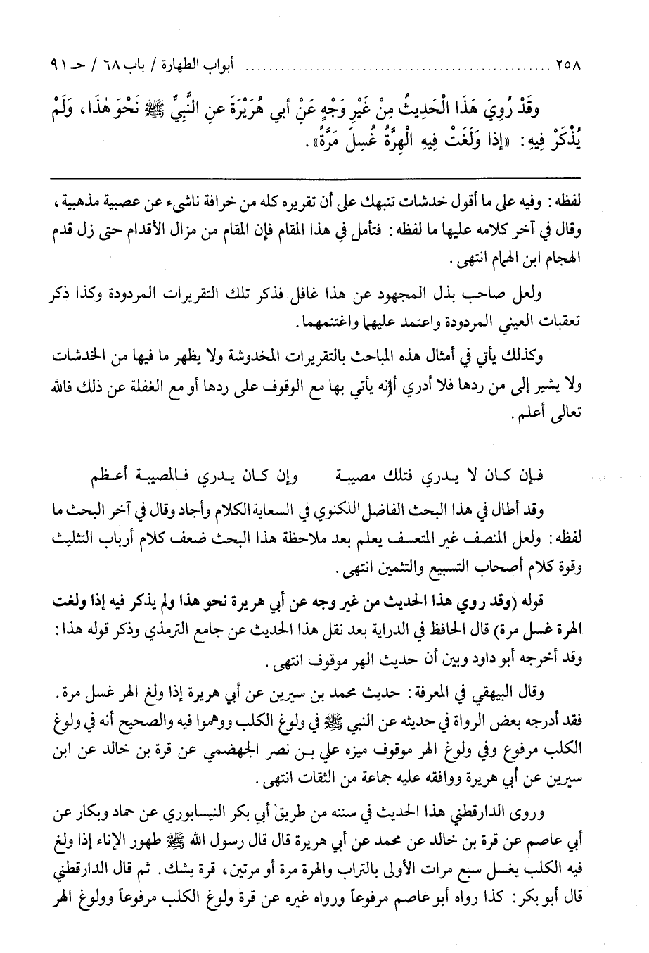قَوْلُهُ (وَقَدْ رُوِيَ هَذَا الْحَدِيثُ مِنْ غَيْرِ وَجْهٍ عَنْ أَبِي هُرَيْرَةَ نَحْوَ هَذَا وَلَمْ يُذْكَرْ فِيهِ إِذَا وَلَغَتِ الْهِرَّةُ غُسِلَ مَرَّةً) قَالَ الْحَافِظُ فِي الدِّرَايَةِ بَعْدَ نَقْلِ هَذَا الْحَدِيثِ عَنْ جَامِعِ التِّرْمِذِيِّ وَذَكَرَ قَوْلَهُ هَذَا وَقَدْ أَخْرَجَهُ أَبُو دَاوُدَ وَبَيَّنَ أَنَّ الْهِرِّ مَوْقُوفٌ انْتَهَى