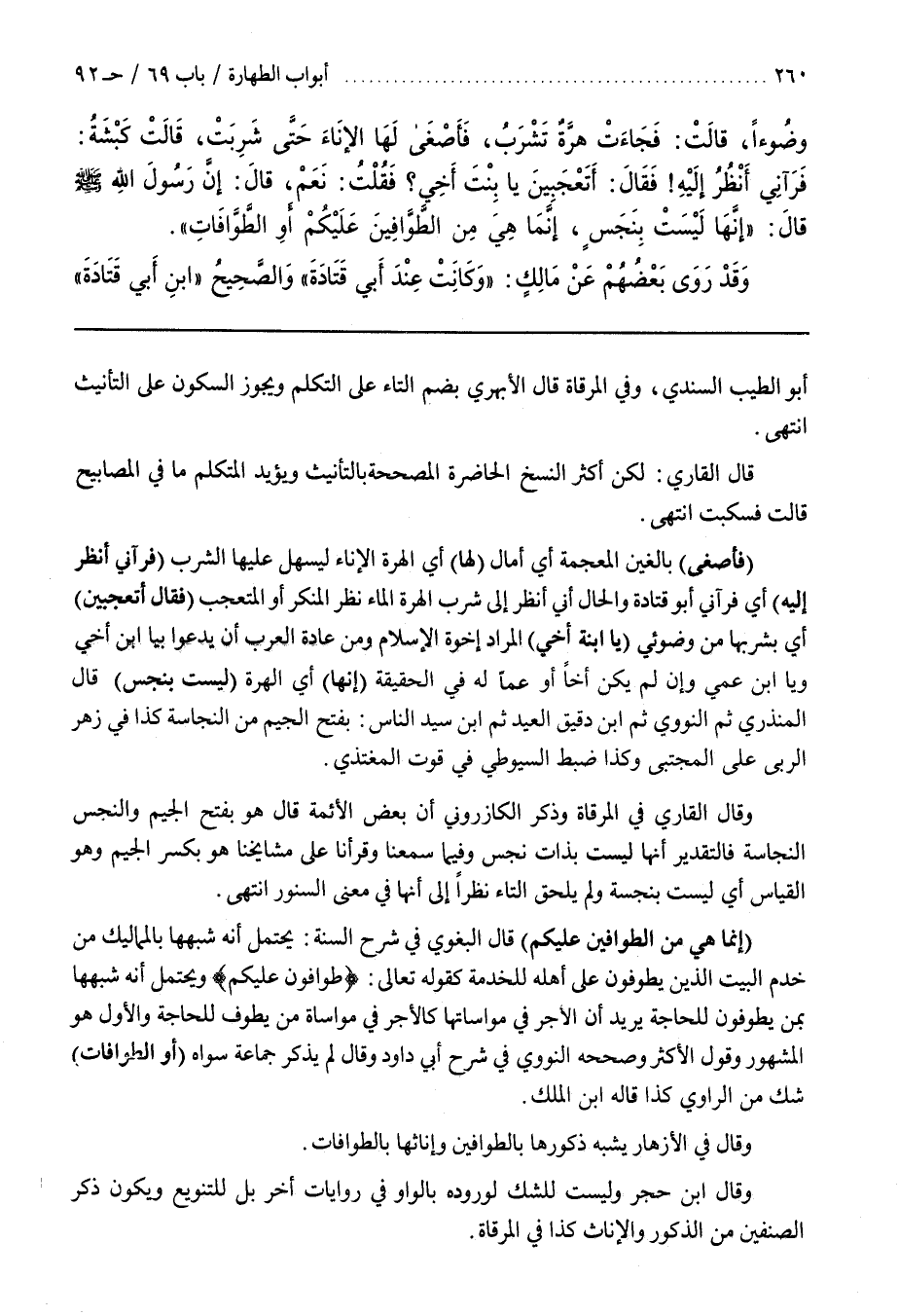 (فَأَصْغَى) بَالِغَيْنِ الْمُعْجَمَةِ أَيْ أَمَالَ (لَهَا) أَيْ الْهِرَّةِ الْإِنَاءَ لِيَسْهُلَ عَلَيْهَا الشُّرْبُ (فَرَآنِي أَنْظُرُ إِلَيْهِ) أَيْ فَرَآنِي أَبُو قَتَادَةَ وَالْحَالُ أَنِّي أَنْظُرُ إِلَى شُرْبِ الْهِرَّةِ الْمَاءَ نَظَرَ الْمُنْكِرِ أَوْ الْمُتَعَجِّبِ (فَقَالَ أَتَعْجَبِينَ) أَيْ بِشُرْبِهَا مِنْ وَضُوئِي (يَا ابْنَةَ أَخِي) الْمُرَادُ أُخُوَّةُ الْإِسْلَامِ ومن عادة العرب أن يدعوا بيا بن أخي ويا بن عَمِّي وَإِنْ لَمْ يَكُنْ أَخًا أَوْ عَمًّا لَهُ فِي الْحَقِيقَةِ (إِنَّهَا) أَيْ الْهِرَّةُ (لَيْسَتْ بنجس)