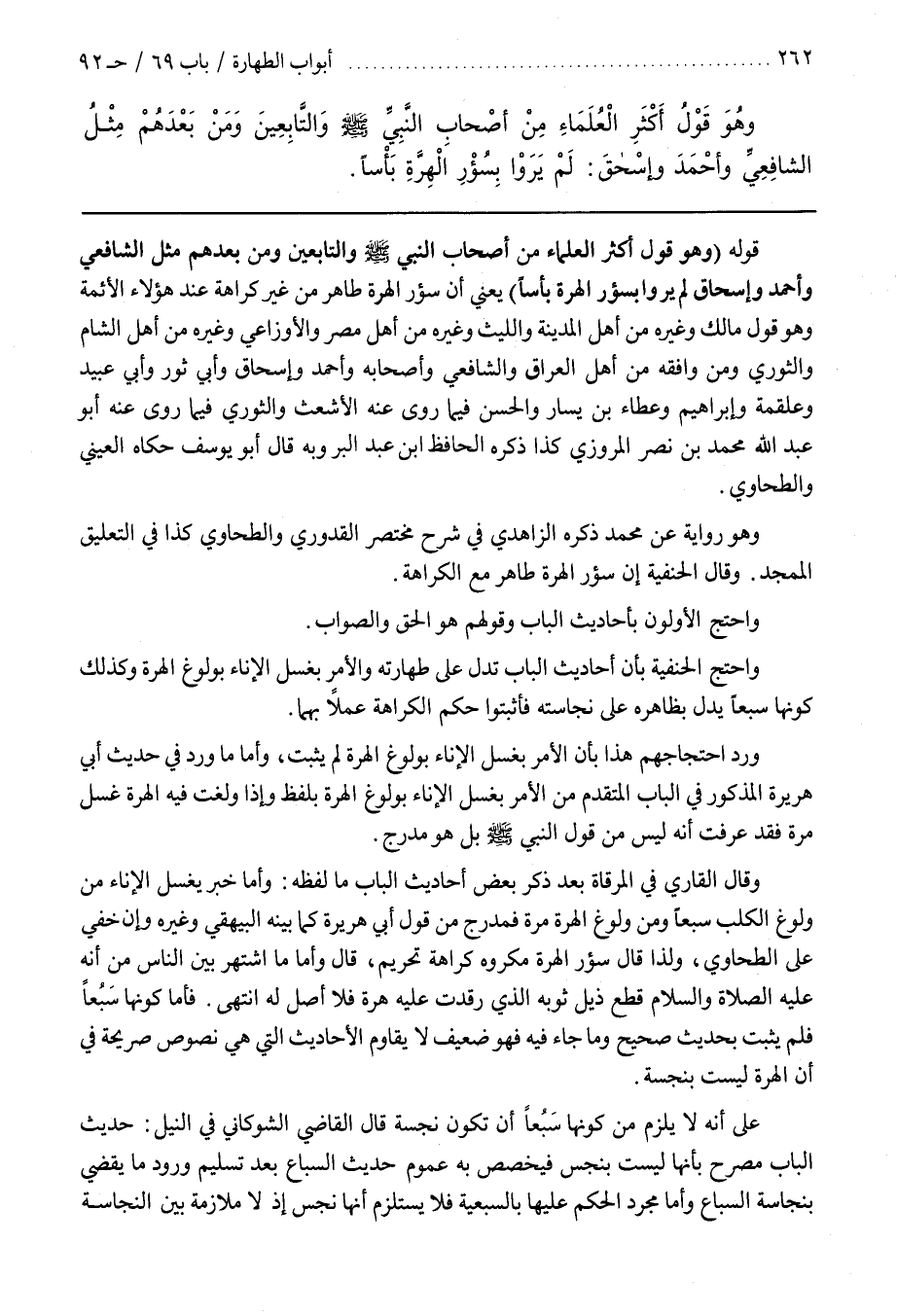 قَوْلُهُ (وَهُوَ قَوْلُ أَكْثَرِ الْعُلَمَاءِ مِنْ أَصْحَابِ النَّبِيِّ صَلَّى اللَّهُ عَلَيْهِ وَسَلَّمَ وَالتَّابِعِينَ وَمَنْ بَعْدَهُمْ مِثْلَ الشَّافِعِيِّ وَأَحْمَدَ وَإِسْحَاقَ لَمْ يَرَوْا بِسُؤْرِ الْهِرَّةِ بَأْسًا) يَعْنِي أَنَّ سُؤْرَ الْهِرَّةِ طَاهِرٌ مِنْ غَيْرِ كَرَاهَةٍ عِنْدَ هَؤُلَاءِ الْأَئِمَّةِ وَهُوَ قَوْلُ مَالِكٍ وَغَيْرِهِ مِنْ أَهْلِ الْمَدِينَةِ وَاللَّيْثِ وَغَيْرِهِ مِنْ أَهْلِ مِصْرَ وَالْأَوْزَاعِيِّ وَغَيْرِهِ مِنْ أَهْلِ الشَّامِ وَالثَّوْرِيِّ وَمَنْ وَافَقَهُ مِنْ أَهْلِ الْعِرَاقِ وَالشَّافِعِيِّ وَأَصْحَابِهِ وَأَحْمَدَ وَإِسْحَاقَ وَأَبِي ثَوْرٍ وَأَبِي عُبَيْدٍ وَعَلْقَمَةَ وَإِبْرَاهِيمَ وَعَطَاءِ بْنِ يَسَارٍ وَالْحَسَنِ فِيمَا رَوَى عَنْهُ الْأَشْعَثُ وَالثَّوْرِيِّ فِيمَا رَوَى عَنْهُ أَبُو عَبْدِ اللَّهِ مُحَمَّدُ بن نصر المروزي كذا ذكره الحافظ بن عَبْدِ الْبَرِّ وَبِهِ قَالَ أَبُو يُوسُفَ حَكَاهُ الْعَيْنِيُّ وَالطَّحَاوِيُّ