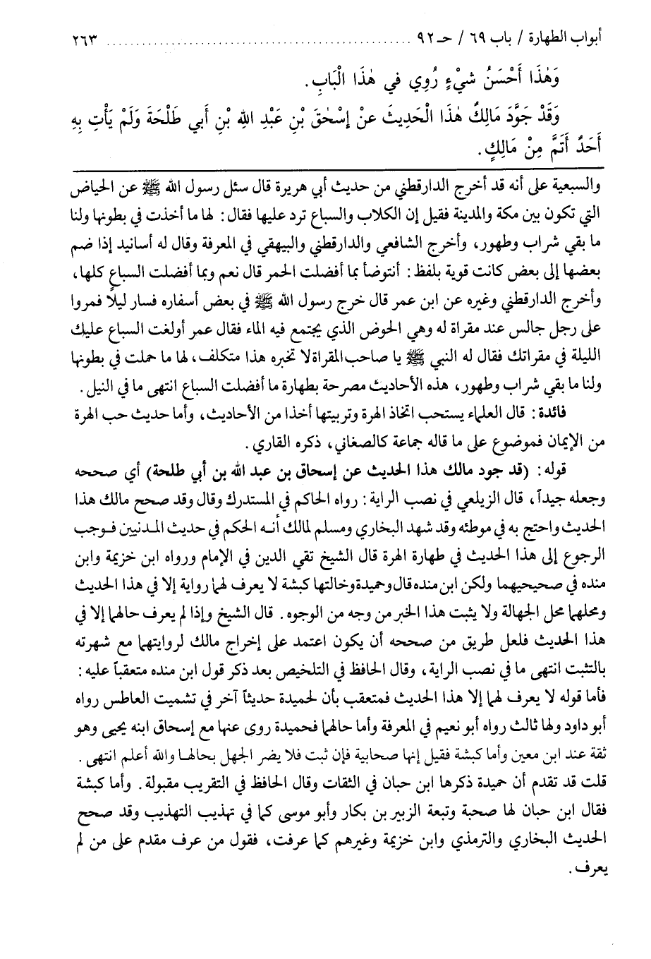 رَوَاهُ الْحَاكِمُ فِي الْمُسْتَدْرَكِ وَقَالَ وَقَدْ صَحَّحَ مَالِكٌ هَذَا الْحَدِيثَ وَاحْتَجَّ بِهِ فِي مُوَطَّئِهِ وَقَدْ شَهِدَ الْبُخَارِيُّ وَمُسْلِمٌ لِمَالِكٍ أَنَّهُ الْحَكَمُ فِي حَدِيثِ الْمَدَنِيِّينَ فَوَجَبَ الرُّجُوعُ إِلَى هَذَا الْحَدِيثِ فِي طَهَارَةِ الْهِرَّةِ قَالَ الشيخ تقي الدين في الإمام ورواه بن خزيمة وبن منده في صحيحيهما ولكن بن مَنْدَهْ قَالَ وَحُمَيْدَةُ وَخَالَتُهَا كَبْشَةُ لَا يُعْرَفُ لَهُمَا رِوَايَةٌ إِلَّا فِي هَذَا الْحَدِيثِ وَمَحَلُّهُمَا مَحَلُّ الْجَهَالَةِ وَلَا يَثْبُتُ هَذَا الْخَبَرُ مِنْ وَجْهٍ مِنَ الْوُجُوهِ