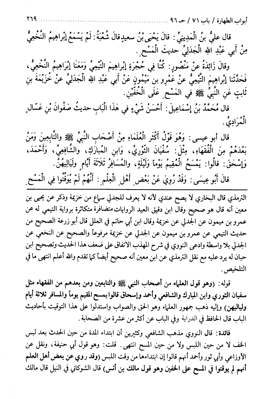 التِّرْمِذِيُّ قَالَ الْبُخَارِيُّ لَا يَصِحُّ عِنْدِي لِأَنَّهُ لَا يُعْرَفُ لِلْجَدَلِيِّ سَمَاعٌ مِنْ خُزَيْمَةَ وَذَكَرَ عَنْ يَحْيَى بْنِ مَعِينٍ أَنَّهُ قَالَ هُوَ صحيح وقال بن دَقِيقِ الْعِيدِ الرِّوَايَاتُ مُتَظَافِرَةٌ مُتَكَاثِرَةٌ بِرِوَايَةِ التَّيْمِيِّ لَهُ عَنْ عَمْرِو بْنِ مَيْمُونٍ عَنِ الْجَدَلِيِّ عن خزيمة وقال بن أَبِي حَاتِمٍ فِي الْعِلَلِ قَالَ أَبُو زُرْعَةَ الصَّحِيحُ مِنْ حَدِيثِ التَّيْمِيِّ عَنْ عَمْرِو بْنِ مَيْمُونٍ عَنِ الْجَدَلِيِّ عَنْ خُزَيْمَةَ مَرْفُوعًا وَالصَّحِيحُ عَنِ النَّخَعِيِّ عَنِ الْجَدَلِيِّ بِلَا وَاسِطَةٍ وَادَّعَى النَّوَوِيُّ فِي شَرْحِ الْمُهَذَّبِ الِاتِّفَاقَ عَلَى ضَعْفِ هذا الحديث وتصحيح بن حِبَّانَ لَهُ يَرُدُّ عَلَيْهِ مَعَ نَقْلِ التِّرْمِذِيِّ عن بن مَعِينٍ أَنَّهُ صَحِيحٌ أَيْضًا كَمَا تَقَدَّمَ وَاللَّهُ أَعْلَمُ انْتَهَى مَا فِي التَّلْخِيصِ