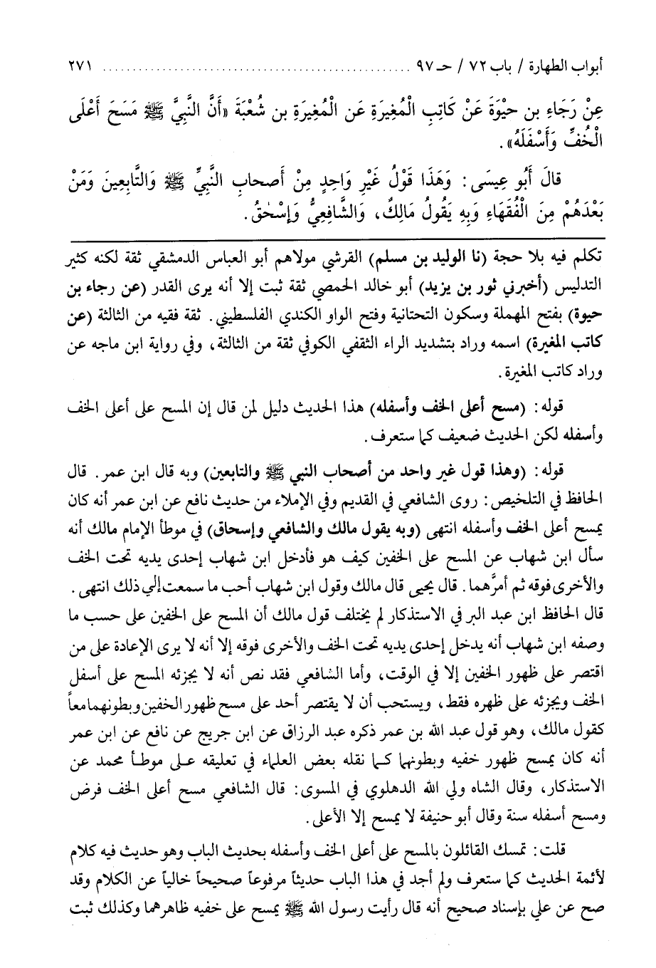 قُلْتُ تَمَسَّكَ الْقَائِلُونَ بِالْمَسْحِ عَلَى أَعْلَى الْخُفِّ وَأَسْفَلِهِ بِحَدِيثِ الْبَابِ وَهُوَ حَدِيثٌ فِيهِ كَلَامٌ لِأَئِمَّةِ الْحَدِيثِ كَمَا سَتَعْرِفُ وَلَمْ أَجِدْ فِي هَذَا الْبَابِ حَدِيثًا مَرْفُوعًا صَحِيحًا خَالِيًا عَنِ الْكَلَامِ وَقَدْ صَحَّ عَنْ عَلِيٍّ بِإِسْنَادٍ صَحِيحٍ أَنَّهُ قَالَ رَأَيْتُ رَسُولَ اللَّهِ صَلَّى اللَّهُ عَلَيْهِ وَسَلَّمَ يَمْسَحُ عَلَى خُفَّيْهِ ظَاهِرَهُمَا وَكَذَلِكَ ثَبَتَ