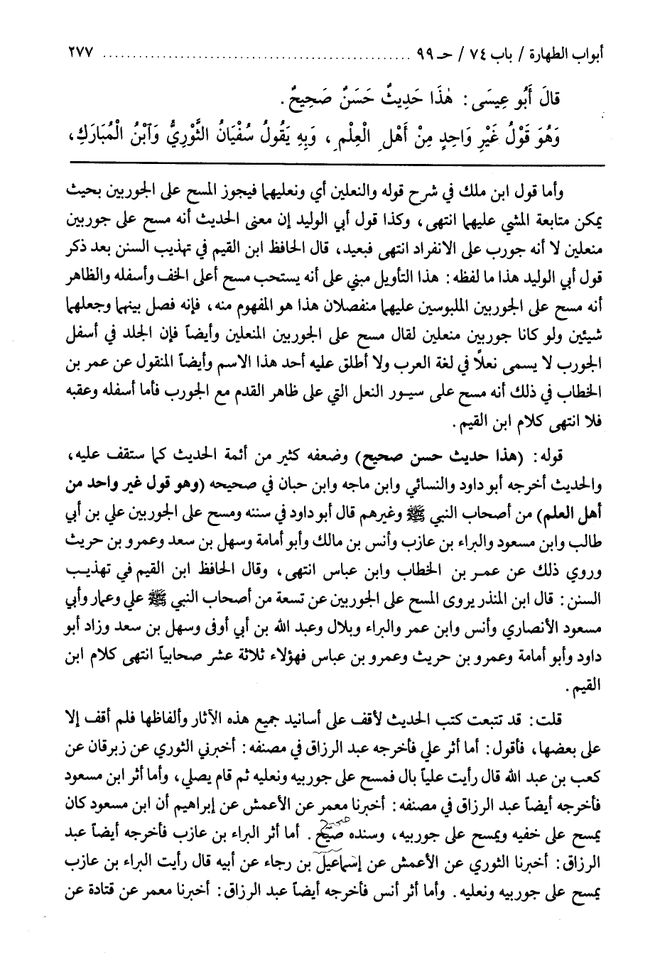قَوْلُهُ (هَذَا حَدِيثٌ حَسَنٌ صَحِيحٌ) وَضَعَّفَهُ كَثِيرٌ مِنْ أَئِمَّةِ الْحَدِيثِ كَمَا سَتَقِفُ عَلَيْهِ والحديث أخرجه أبو داود والنسائي وبن ماجه وبن حِبَّانَ فِي صَحِيحِهِ (وَهُوَ قَوْلُ غَيْرِ وَاحِدٍ مِنْ أَهْلِ الْعِلْمِ) مِنْ أَصْحَابِ النَّبِيِّ صَلَّى اللَّهُ عَلَيْهِ وَسَلَّمَ وَغَيْرِهِمْ قَالَ أَبُو دَاوُدَ فِي سُنَنِهِ وَمَسَحَ عَلَى الْجَوْرَبَيْنِ عَلِيُّ بْنُ أبي طالب وبن مَسْعُودٍ وَالْبَرَاءُ بْنُ عَازِبٍ وَأَنَسُ بْنُ مَالِكٍ وَأَبُو أُمَامَةَ وَسَهْلُ بْنُ سَعْدٍ وَعَمْرُو بْنُ حُرَيْثٍ وَرُوِيَ ذَلِكَ عَنْ عُمَرَ بْنِ الْخَطَّابِ وبن عباس انتهى وقال الحافظ بن القيم في تهذيب السنن قال بن الْمُنْذِرِ يُرْوَى الْمَسْحُ عَلَى الْجَوْرَبَيْنِ عَنْ تِسْعَةٍ مِنْ أَصْحَابِ النَّبِيِّ صَلَّى اللَّهُ عَلَيْهِ وَسَلَّمَ علي وعمار وأبي مسعود الأنصاري وأنس وبن عُمَرَ وَالْبَرَاءِ وَبِلَالٍ وَعَبْدِ اللَّهِ بْنِ أَبِي أَوْفَى وَسَهْلِ بْنِ سَعْدٍ وَزَادَ أَبُو دَاوُدَ وَأَبُو أُمَامَةَ وَعَمْرُو بْنُ حُرَيْثٍ وَعَمْرُو بْنُ عَبَّاسٍ فَهَؤُلَاءِ ثَلَاثَةَ عَشَرَ صَحَابِيًّا انْتَهَى كَلَامُ بن الْقَيِّمِ