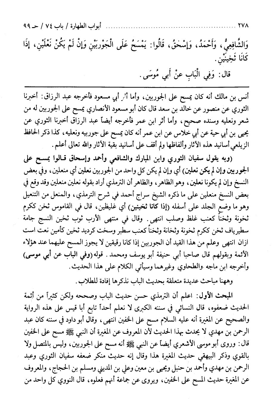 الْمَبْحَثُ الْأَوَّلُ اعْلَمْ أَنَّ التِّرْمِذِيَّ حَسَّنَ حَدِيثَ الْبَابِ وَصَحَّحَهُ وَلَكِنَّ كَثِيرًا مِنْ أَئِمَّةِ الْحَدِيثِ ضَعَّفُوهُ قَالَ النَّسَائِيُّ فِي سُنَنِهِ الْكُبْرَى لَا نَعْلَمُ أَحَدًا تَابَعَ أَبَا قَيْسٍ عَلَى هَذِهِ الرِّوَايَةِ وَالصَّحِيحُ عَنِ الْمُغِيرَةِ أَنَّهُ عَلَيْهِ السَّلَامُ مَسَحَ عَلَى الْخُفَّيْنِ انْتَهَى وَقَالَ أَبُو دَاوُدَ فِي سُنَنِهِ كَانَ عَبْدُ الرَّحْمَنِ بْنُ مَهْدِيٍّ لَا يُحَدِّثُ بِهَذَا الْحَدِيثِ لِأَنَّ الْمَعْرُوفَ عَنِ الْمُغِيرَةِ أَنَّ النَّبِيَّ صَلَّى اللَّهُ عَلَيْهِ وَسَلَّمَ مَسَحَ عَلَى الْخُفَّيْنِ قَالَ وَرَوَى أَبُو مُوسَى الْأَشْعَرِيُّ أَيْضًا عَنِ النَّبِيِّ صَلَّى اللَّهُ عَلَيْهِ وَسَلَّمَ أَنَّهُ مَسَحَ عَلَى الْجَوْرَبَيْنِ وَلَيْسَ بِالْمُتَّصِلِ وَلَا بِالْقَوِيِّ وَذَكَرَ الْبَيْهَقِيُّ حَدِيثَ الْمُغِيرَةِ هَذَا وَقَالَ إِنَّهُ حَدِيثٌ مُنْكَرٌ ضَعَّفَهُ سُفْيَانُ الثَّوْرِيُّ وَعَبْدُ الرَّحْمَنِ بْنُ مَهْدِيٍّ وَأَحْمَدُ بْنُ حَنْبَلٍ وَيَحْيَى بْنُ مَعِينٍ وَعَلَيُّ بْنُ الْمَدِينِيِّ وَمُسْلِمُ بْنُ الْحَجَّاجِ وَالْمَعْرُوفُ عَنِ الْمُغِيرَةِ حَدِيثُ الْمَسْحِ عَلَى الْخُفَّيْنِ وَيُرْوَى عَنْ جَمَاعَةٍ أَنَّهُمْ فَعَلُوهُ قَالَ النَّوَوِيُّ كُلُّ وَاحِدٍ مِنْ