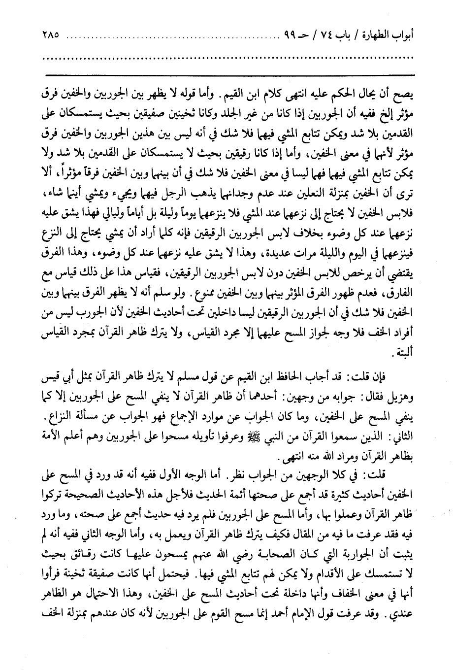 فَإِنْ قُلْتَ قَدْ أجاب الحافظ بن الْقَيِّمِ عَنْ قَوْلِ مُسْلِمٍ لَا يُتْرَكُ ظَاهِرُ الْقُرْآنِ بِمِثْلِ أَبِي قَيْسٍ وَهُزَيْلٍ فَقَالَ جَوَابُهُ مِنْ وَجْهَيْنِ أَحَدُهُمَا أَنَّ ظَاهِرَ الْقُرْآنِ لَا يَنْفِي الْمَسْحَ عَلَى الْجَوْرَبَيْنِ إِلَّا كَمَا يَنْفِي الْمَسْحَ عَلَى الْخُفَّيْنِ وَمَا كَانَ الْجَوَابُ عَنْ مَوَارِدِ الْإِجْمَاعِ فَهُوَ الْجَوَابُ عَنْ مَسْأَلَةِ النِّزَاعِ