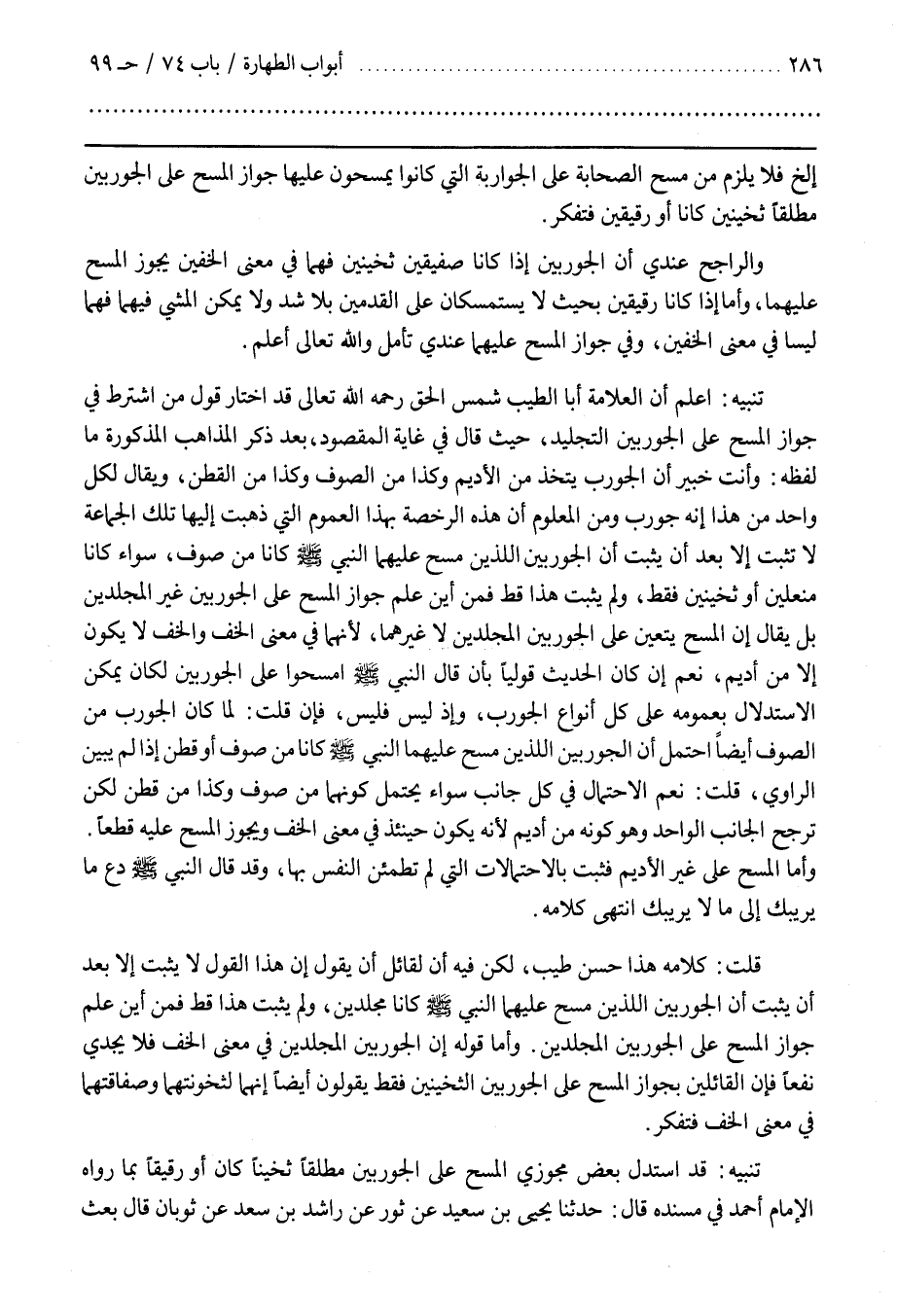 تَنْبِيهٌ اعْلَمْ أَنَّ الْعَلَّامَةَ أَبَا الطَّيِّبِ شَمْسَ الْحَقِّ رَحِمَهُ اللَّهُ تَعَالَى قَدِ اخْتَارَ قَوْلَ مَنِ اشْتَرَطَ فِي جَوَازِ الْمَسْحِ عَلَى الْجَوْرَبَيْنِ التَّجْلِيدَ حَيْثُ قَالَ فِي غَايَةِ الْمَقْصُودِ بَعْدَ ذِكْرِ الْمَذَاهِبِ الْمَذْكُورَةِ مَا لَفْظُهُ وَأَنْتَ خَبِيرٌ أَنَّ الْجَوْرَبَ يُتَّخَذُ مِنَ الْأَدِيمِ وَكَذَا مِنَ الصُّوفِ وَكَذَا مِنَ الْقُطْنِ وَيُقَالُ لِكُلِّ وَاحِدٍ مِنْ هَذَا إِنَّهُ جَوْرَبٌ وَمِنَ الْمَعْلُومِ أَنَّ هَذِهِ الرُّخْصَةَ بِهَذَا الْعُمُومِ الَّتِي ذَهَبَتْ إِلَيْهَا تِلْكَ الْجَمَاعَةُ لَا تَثْبُتُ إِلَّا بعد أن يثبت أن الجوربين الذين مَسَحَ عَلَيْهِمَا النَّبِيُّ صَلَّى اللَّهُ عَلَيْهِ وَسَلَّمَ كَانَا مِنْ صُوفٍ سَوَاءٌ كَانَا مُنَعَّلَيْنِ أَوْ ثَخِينَيْنِ فَقَطْ وَلَمْ يَثْبُتْ هَذَا قَطُّ فَمِنْ أَيْنَ عُلِمَ جَوَازُ الْمَسْحِ عَلَى الْجَوْرَبَيْنِ غَيْرِ الْمُجَلَّدَيْنِ بَلْ يُقَالُ إِنَّ الْمَسْحَ يَتَعَيَّنُ عَلَى الْجَوْرَبَيْنِ الْمُجَلَّدَيْنِ لَا غَيْرَهُمَا
