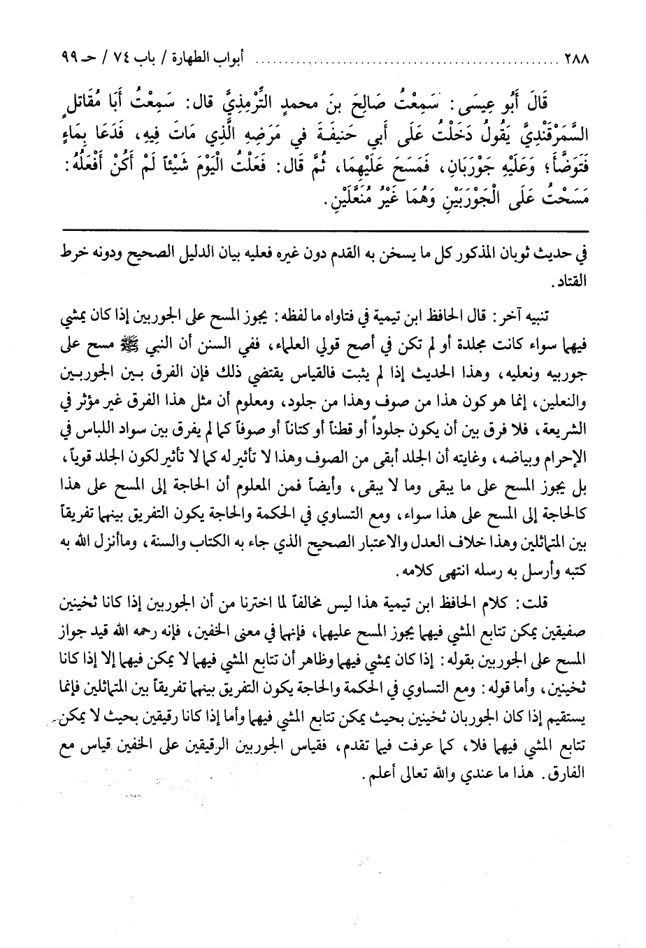 تَنْبِيهٌ آخَرُ قَالَ الحافظ بن تَيْمِيَّةَ فِي فَتَاوَاهُ مَا لَفْظُهُ يَجُوزُ الْمَسْحُ عَلَى الْجَوْرَبَيْنِ إِذَا كَانَ يَمْشِي فِيهِمَا سَوَاءٌ كَانَتْ مُجَلَّدَةً أَوْ لَمْ تَكُنْ فِي أَصَحِّ قَوْلَيْ الْعُلَمَاءِ فَفِي السُّنَنِ أَنَّ النَّبِيَّ صَلَّى اللَّهُ عَلَيْهِ وَسَلَّمَ مَسَحَ عَلَى جَوْرَبَيْهِ وَنَعْلَيْهِ وَهَذَا الْحَدِيثُ إِذَا لَمْ يَثْبُتْ فَالْقِيَاسُ يَقْتَضِي ذَلِكَ فَإِنَّ الْفَرْقَ بَيْنَ الْجَوْرَبَيْنِ وَالنَّعْلَيْنِ