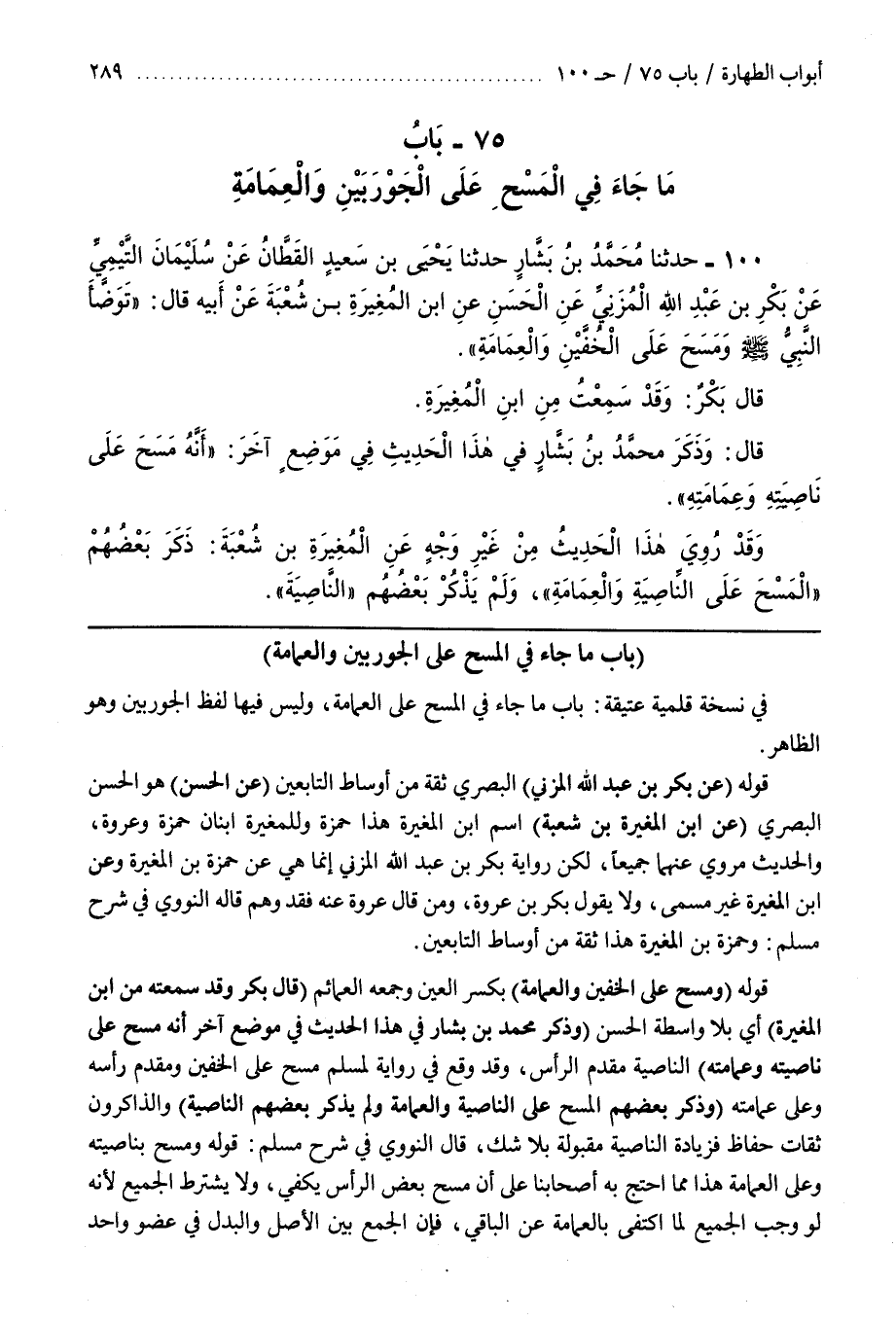 فِي نُسْخَةٍ قَلَمِيَّةٍ عَتِيقَةٍ بَابُ مَا جَاءَ فِي الْمَسْحِ عَلَى الْعِمَامَةِ وَلَيْسَ فِيهَا لَفْظُ الْجَوْرَبَيْنِ وَهُوَ الظَّاهِرُ