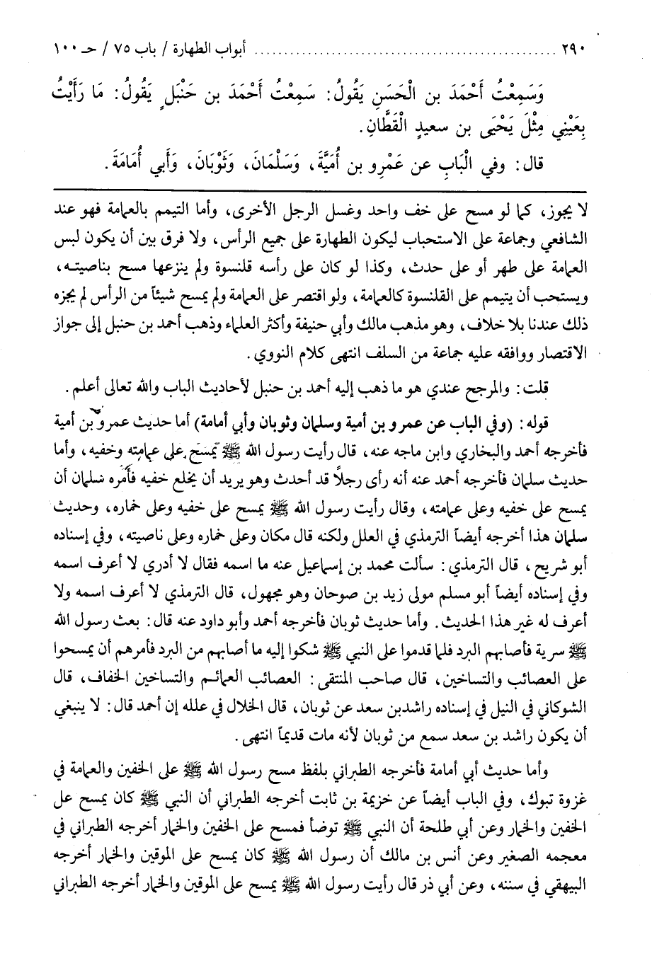 قَوْلُهُ (وَفِي الْبَابِ عَنْ عَمْرِو بْنِ أُمَيَّةَ وَسَلْمَانَ وَثَوْبَانَ وَأَبِي أُمَامَةَ) أَمَّا حَدِيثُ عَمْرِو بن أمية فأخرجه أحمد والبخاري وبن مَاجَهْ عَنْهُ قَالَ رَأَيْتُ رَسُولَ اللَّهِ صَلَّى اللَّهُ عَلَيْهِ وَسَلَّمَ يَمْسَحُ عَلَى عِمَامَتِهِ وَخُفَّيْهِ وَأَمَّا حَدِيثُ سَلْمَانَ فَأَخْرَجَهُ أَحْمَدُ عَنْهُ أَنَّهُ رَأَى رَجُلًا قَدْ أَحْدَثَ وَهُوَ يُرِيدُ أَنْ يَخْلَعَ خُفَّيْهِ فَأَمَرَهُ سَلْمَانُ أَنْ يَمْسَحَ عَلَى خُفَّيْهِ وَعَلَى عِمَامَتِهِ وَقَالَ رَأَيْتُ رَسُولَ اللَّهِ صَلَّى اللَّهُ عَلَيْهِ وَسَلَّمَ يَمْسَحُ عَلَى خُفَّيْهِ وَعَلَى خِمَارِهِ وَحَدِيثُ سَلْمَانَ هَذَا أَخْرَجَهُ أَيْضًا التِّرْمِذِيُّ فِي الْعِلَلِ وَلَكِنَّهُ قَالَ مَكَانَ وَعَلَى خِمَارِهِ وَعَلَى نَاصِيَتِهِ وَفِي إِسْنَادِهِ أَبُو شُرَيْحٍ قَالَ التِّرْمِذِيُّ سَأَلْتُ مُحَمَّدَ بْنَ إِسْمَاعِيلَ عَنْهُ مَا اسْمُهُ فَقَالَ لَا أَدْرِي لَا أَعْرِفُ اسْمَهُ وَفِي إِسْنَادِهِ أَيْضًا أَبُو مُسْلِمٍ مَوْلَى زَيْدِ بْنِ صُوحَانَ وَهُوَ مَجْهُولٌ قَالَ التِّرْمِذِيُّ لَا أَعْرِفُ اسْمَهُ وَلَا أَعْرِفُ لَهُ غَيْرَ هَذَا الْحَدِيثِ