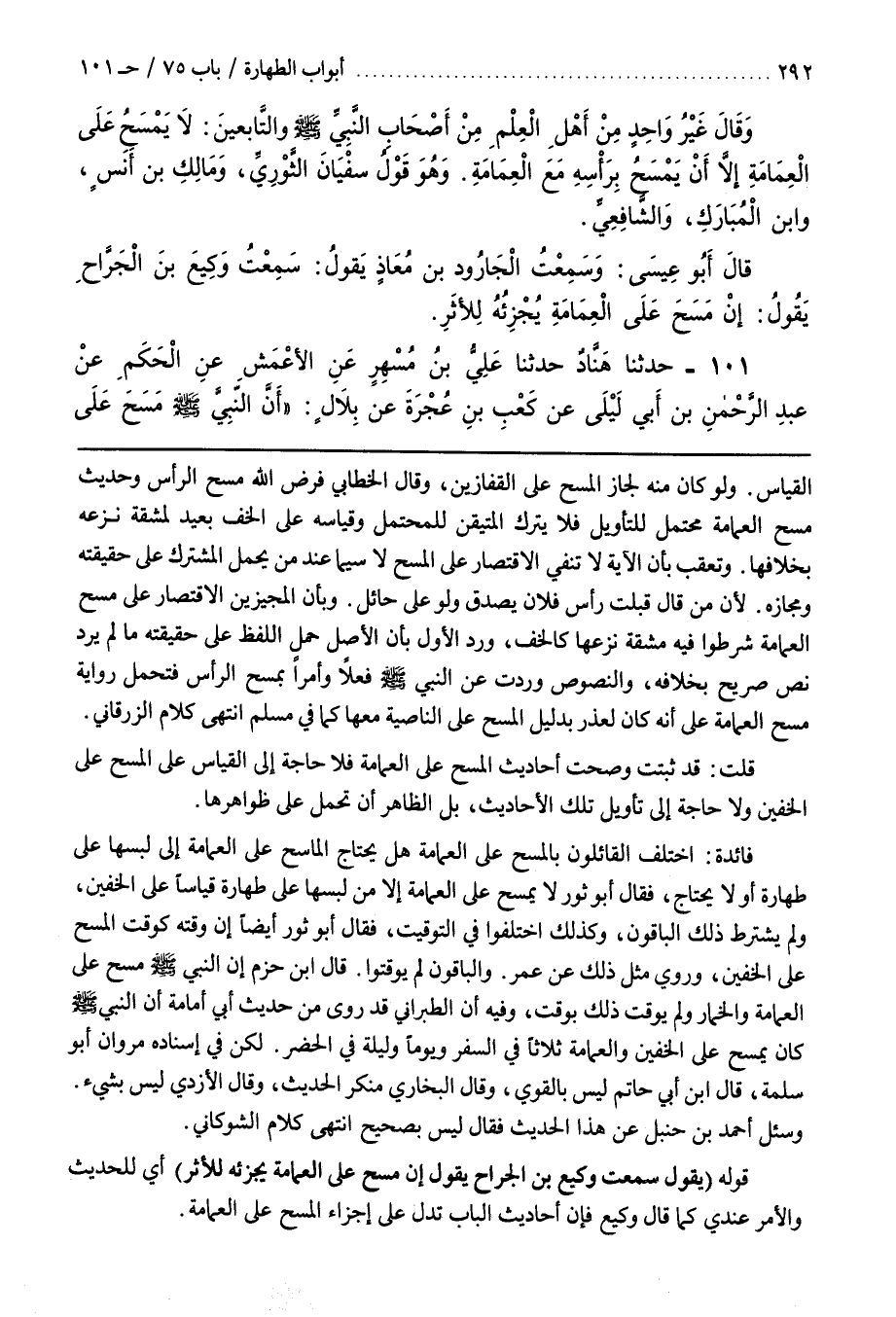 قُلْتُ قَدْ ثَبَتَتْ وَصَحَّتْ أَحَادِيثُ الْمَسْحِ عَلَى الْعِمَامَةِ فَلَا حَاجَةَ إِلَى الْقِيَاسِ عَلَى الْمَسْحِ عَلَى الْخُفَّيْنِ وَلَا حَاجَةَ إِلَى تَأْوِيلِ تِلْكَ الْأَحَادِيثِ بَلْ الظَّاهِرُ أَنْ تُحْمَلَ عَلَى ظَوَاهِرِهَا فَائِدَةٌ اخْتَلَفَ الْقَائِلُونَ بِالْمَسْحِ عَلَى الْعِمَامَةِ هَلْ يَحْتَاجُ الْمَاسِحُ عَلَى الْعِمَامَةِ إِلَى لُبْسِهَا عَلَى طَهَارَةٍ أَوْ لَا يَحْتَاجُ فَقَالَ أَبُو ثَوْرٍ لَا يَمْسَحُ عَلَى الْعِمَامَةِ إِلَّا مَنْ لَبِسَهَا عَلَى طَهَارَةٍ قِيَاسًا عَلَى الْخُفَّيْنِ وَلَمْ يَشْتَرِطْ ذَلِكَ الْبَاقُونَ وَكَذَلِكَ اخْتَلَفُوا فِي التَّوْقِيتِ فَقَالَ أَبُو ثَوْرٍ أَيْضًا إِنَّ وَقْتَهُ كَوَقْتِ الْمَسْحِ عَلَى الْخُفَّيْنِ وَرُوِيَ مِثْلُ ذَلِكَ عَنْ عمر