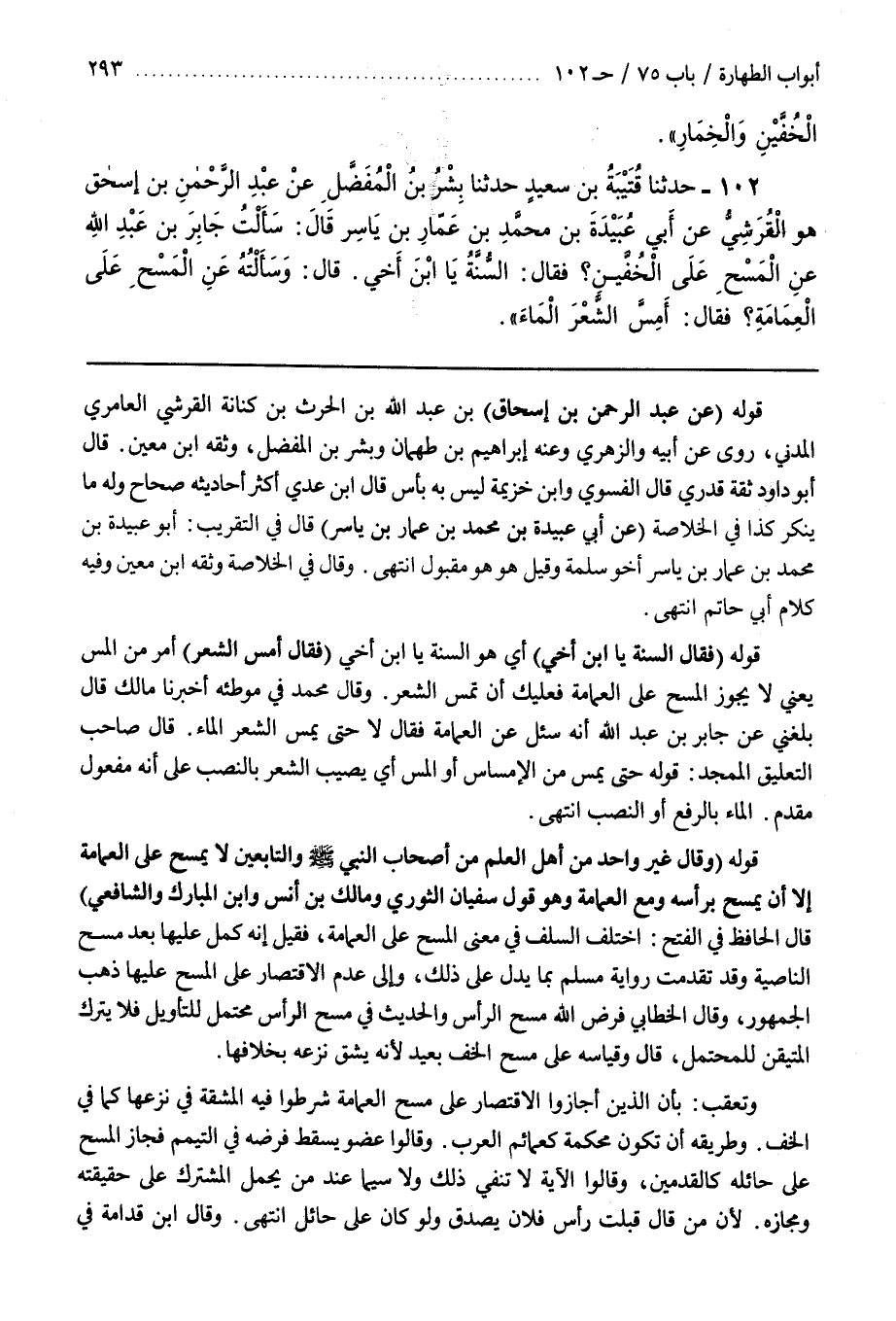 قَوْلُهُ (وَقَالَ غَيْرُ وَاحِدٍ مِنْ أَهْلِ الْعِلْمِ مِنْ أَصْحَابِ النَّبِيِّ صَلَّى اللَّهُ عَلَيْهِ وَسَلَّمَ وَالتَّابِعِينَ لَا يَمْسَحُ عَلَى الْعِمَامَةِ إِلَّا أَنْ يَمْسَحَ بِرَأْسِهِ وَمَعَ الْعِمَامَةِ وَهُوَ قَوْلُ سُفْيَانَ الثَّوْرِيِّ وَمَالِكِ بْنِ أَنَسٍ وبن الْمُبَارَكِ وَالشَّافِعِيِّ) قَالَ الْحَافِظُ فِي الْفَتْحِ اخْتَلَفَ السَّلَفُ فِي مَعْنَى الْمَسْحِ عَلَى الْعِمَامَةِ فَقِيلَ إِنَّهُ كَمَّلَ عَلَيْهَا بَعْدَ مَسْحِ النَّاصِيَةِ وَقَدْ تَقَدَّمَتْ رِوَايَةُ مُسْلِمٍ بِمَا يَدُلُّ عَلَى ذَلِكَ وَإِلَى عَدَمِ الِاقْتِصَارِ عَلَى الْمَسْحِ عَلَيْهَا ذَهَبَ الْجُمْهُورُ وَقَالَ الْخَطَّابِيُّ فَرَضَ اللَّهُ مَسْحَ الرَّأْسِ وَالْحَدِيثُ فِي مَسْحِ الرَّأْسِ مُحْتَمِلٌ لِلتَّأْوِيلِ فَلَا يُتْرَكُ الْمُتَيَقَّنُ لِلْمُحْتَمَلِ قَالَ وَقِيَاسُهُ عَلَى مَسْحِ الْخُفِّ بَعِيدٌ لِأَنَّهُ يَشُقُّ نَزْعُهُ بِخِلَافِهَا