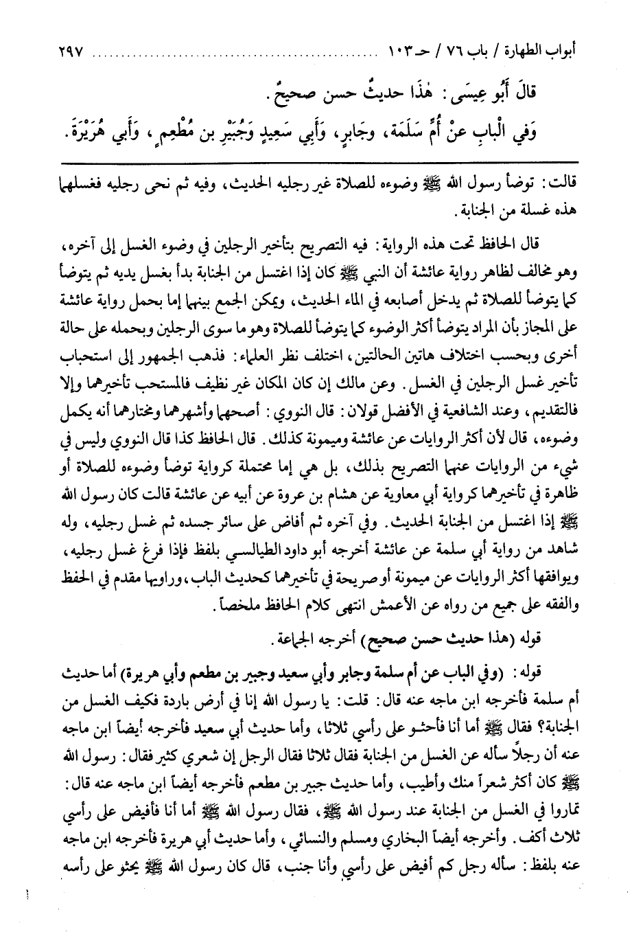 وَفِي آخِرِهِ ثُمَّ أَفَاضَ عَلَى سَائِرِ جَسَدِهِ ثُمَّ غَسَلَ رِجْلَيْهِ وَلَهُ شَاهِدٌ مِنْ رِوَايَةِ أَبِي سَلَمَةَ عَنْ عَائِشَةَ أَخْرَجَهُ أبو داود والطيالسي بِلَفْظِ فَإِذَا فَرَغَ غَسَلَ رِجْلَيْهِ وَيُوَافِقُهَا أَكْثَرُ الرِّوَايَاتِ عَنْ مَيْمُونَةَ أَوْ صَرِيحَةٌ فِي تَأْخِيرِهِمَا كَحَدِيثِ الْبَابِ وَرَاوِيهَا مُقَدَّمٌ فِي الْحِفْظِ وَالْفِقْهِ عَلَى جَمِيعِ مَنْ رَوَاهُ عَنِ الْأَعْمَشِ انْتَهَى كَلَامُ الْحَافِظِ مُلَخَّصًا