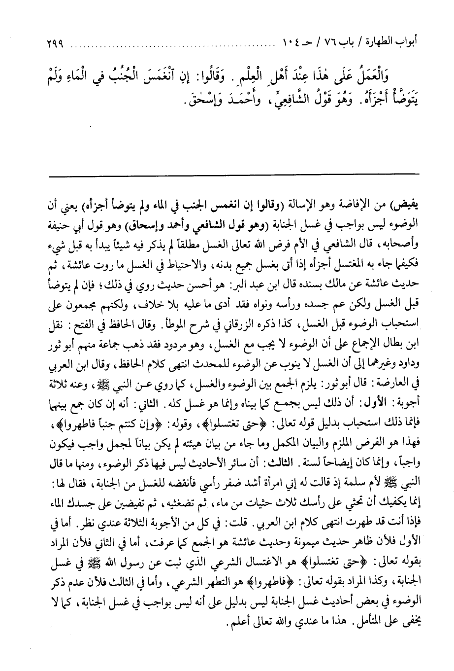 وَقَالَ الْحَافِظُ في الفتح نقل بن بَطَّالٍ الْإِجْمَاعَ عَلَى أَنَّ الْوُضُوءَ لَا يَجِبُ مَعَ الْغُسْلِ وَهُوَ مَرْدُودٌ فَقَدْ ذَهَبَ جَمَاعَةٌ مِنْهُمْ أَبُو ثَوْرٍ وَدَاوُدُ وَغَيْرُهُمَا إِلَى أَنَّ الْغُسْلَ لَا يَنُوبُ عَنِ الْوُضُوءِ لِلْمُحْدِثِ انْتَهَى كلام الحافظ وقال بن الْعَرَبِيِّ فِي الْعَارِضَةِ قَالَ أَبُو ثَوْرٍ يَلْزَمُ الْجَمْعُ بَيْنَ الْوُضُوءِ وَالْغُسْلِ كَمَا رُوِيَ عَنِ النَّبِيِّ صَلَّى اللَّهُ عَلَيْهِ وَسَلَّمَ وَعَنْهُ ثَلَاثَةُ أَجْوِبَةٍ الْأَوَّلُ أَنَّ ذَلِكَ لَيْسَ بِجَمْعٍ كَمَا بَيَّنَّاهُ وَإِنَّمَا هُوَ غُسْلٌ كُلُّهُ