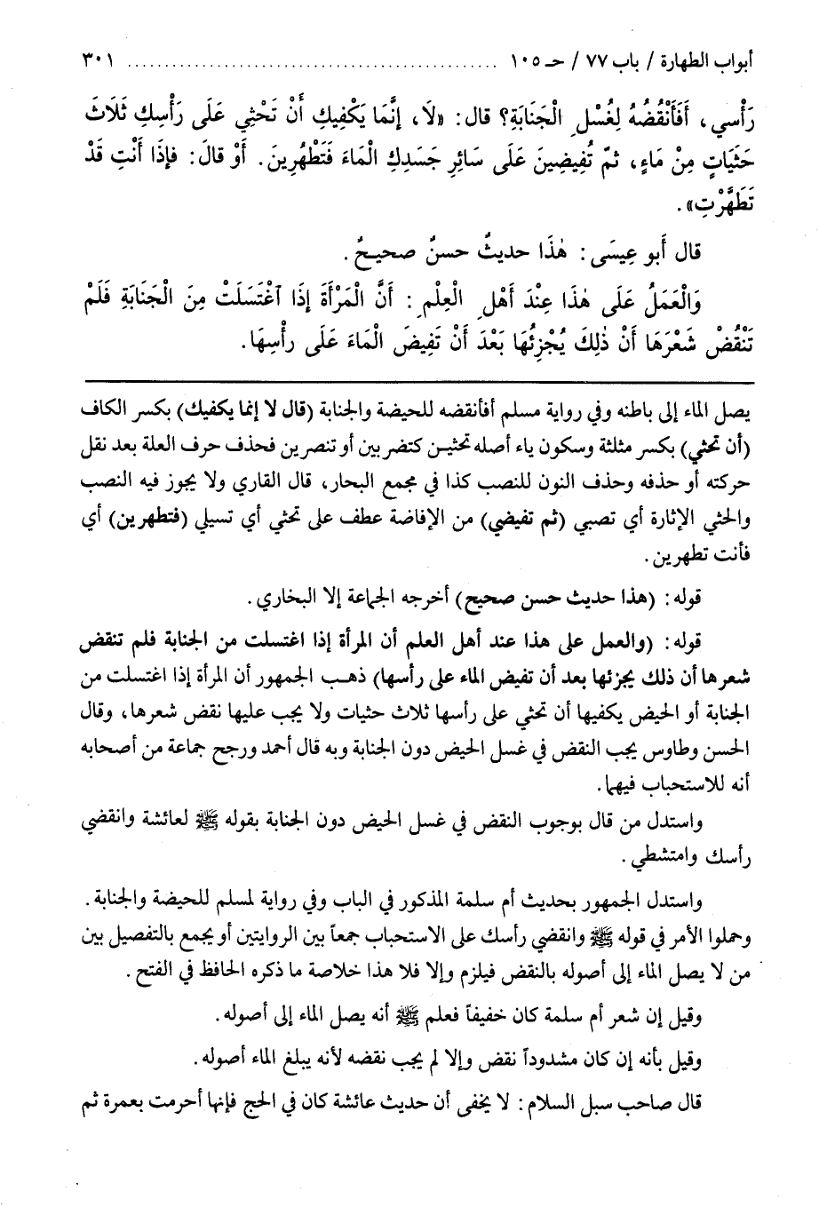 قَوْلُهُ (وَالْعَمَلُ عَلَى هَذَا عِنْدَ أَهْلِ الْعِلْمِ أَنَّ الْمَرْأَةَ إِذَا اغْتَسَلَتْ مِنَ الْجَنَابَةِ فَلَمْ تَنْقُضْ شَعْرَهَا إِنَّ ذَلِكَ يُجْزِئُهَا بعد أن تفيض الماء على رأسها) مذهب الْجُمْهُورِ أَنَّ الْمَرْأَةَ إِذَا اغْتَسَلَتْ مِنَ الْجَنَابَةِ أَوْ الْحَيْضِ يَكْفِيهَا أَنْ تَحْثِي عَلَى رَأْسِهَا ثَلَاثَ حَثَيَاتٍ وَلَا يَجِبُ عَلَيْهَا نَقْضُ شَعْرِهَا وَقَالَ الْحَسَنُ وَطَاوُسٌ يَجِبُ النَّقْضُ فِي غَسْلِ الْحَيْضِ دُونَ الْجَنَابَةِ وَبِهِ قَالَ أَحْمَدُ وَرَجَّحَ جَمَاعَةٌ مِنْ أَصْحَابِهِ أَنَّهُ لِلِاسْتِحْبَابِ فِيهِمَا