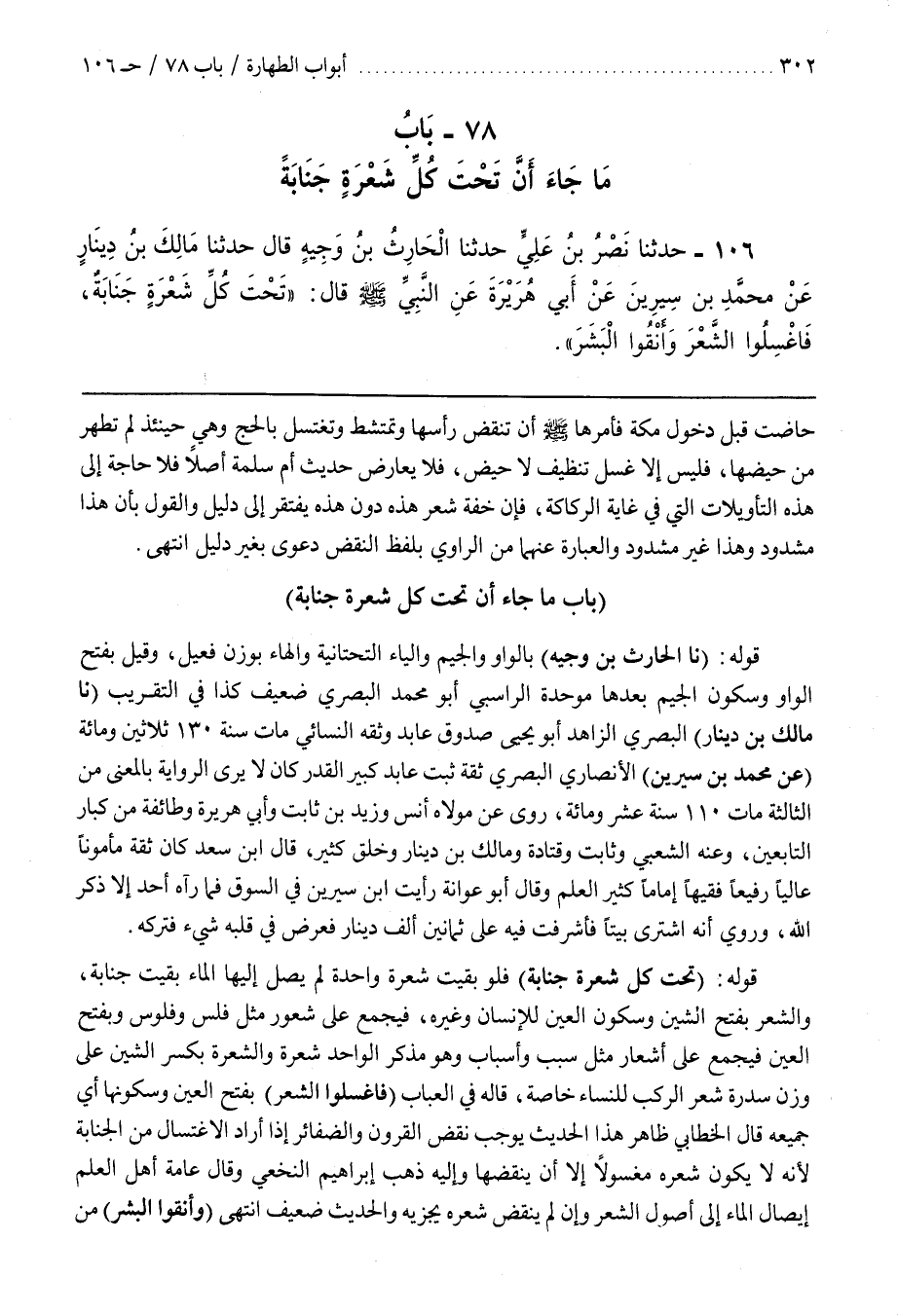 قَوْلُهُ (تَحْتَ كُلِّ شَعْرَةٍ جَنَابَةٌ) فَلَوْ بَقِيَتْ شَعْرَةٌ وَاحِدَةٌ لَمْ يَصِلْ إِلَيْهَا الْمَاءُ بَقِيَتْ جَنَابَةٌ وَالشَّعْرُ بِفَتْحِ الشِّينِ وَسُكُونِ الْعَيْنِ لِلْإِنْسَانِ وَغَيْرِهِ فَيُجْمَعُ عَلَى شُعُورٍ مِثْلَ فَلْسٍ وَفُلُوسٍ وَبِفَتْحِ الْعَيْنِ فَيُجْمَعُ عَلَى أَشْعَارٍ مِثْلَ سَبَبٍ وَأَسْبَابٍ وَهُوَ مُذَكَّرٌ الْوَاحِدَةُ شَعْرَةُ وَالشِّعْرَةُ بِكَسْرِ الشِّينِ عَلَى وَزْنِ سِدْرَةٍ شَعْرُ الرُّكَبِ لِلنِّسَاءِ خَاصَّةً قَالَهُ فِي الْعُبَابِ (فَاغْسِلُوا الشَّعْرَ) بِفَتْحِ الْعَيْنِ وَسُكُونِهَا أَيْ جَمِيعَهُ قَالَ الْخَطَّابِيُّ ظَاهِرُ هَذَا الْحَدِيثِ يُوجِبُ نَقْضَ الْقُرُونِ وَالضَّفَائِرِ إِذَا أَرَادَ الِاغْتِسَالَ مِنَ الْجَنَابَةِ لِأَنَّهُ لَا يَكُونُ شَعْرُهُ مَغْسُولًا إِلَّا أَنْ يَنْقُضَهَا وَإِلَيْهِ ذَهَبَ إِبْرَاهِيمُ النَّخَعِيُّ وَقَالَ عَامَّةُ أَهْلِ الْعِلْمِ إِيصَالُ الْمَاءِ إِلَى أُصُولِ الشَّعْرِ وَإِنْ لَمْ يَنْقُضْ شَعْرَهُ يَجْزِيهِ وَالْحَدِيثُ ضَعِيفٌ انتهى (وأنقوا البشر) من
