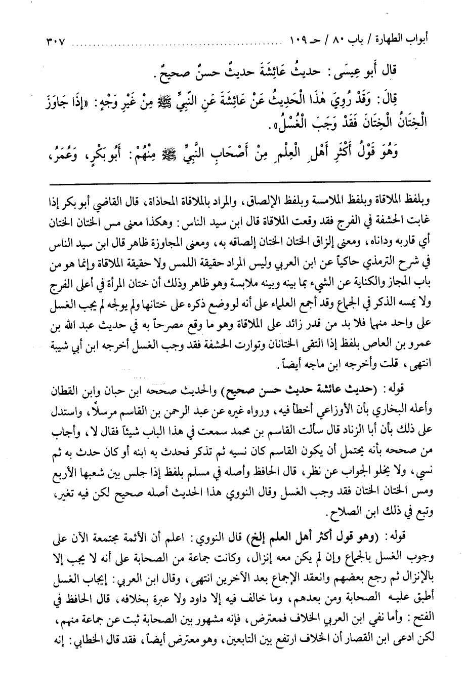 قَوْلُهُ (حَدِيثُ عَائِشَةَ حَدِيثٌ حَسَنٌ صحيح) والحديث صححه بن حبان وبن الْقَطَّانِ وَأَعَلَّهُ الْبُخَارِيُّ بِأَنَّ الْأَوْزَاعِيَّ أَخْطَأَ فِيهِ وَرَوَاهُ غَيْرُهُ عَنْ عَبْدِ الرَّحْمَنِ بْنِ الْقَاسِمِ مُرْسَلًا وَاسْتَدَلَّ عَلَى ذَلِكَ بِأَنَّ أَبَا الزِّنَادِ قَالَ سَأَلْتُ الْقَاسِمَ بْنَ مُحَمَّدٍ سَمِعْتُ فِي هَذَا الْبَابِ شَيْئًا فَقَالَ لَا وَأَجَابَ مَنْ صَحَّحَهُ بِأَنَّهُ يُحْتَمَلُ أَنْ يَكُونَ الْقَاسِمُ كَانَ نَسِيَهُ ثُمَّ تَذَكَّرَ فَحَدَّثَ بِهِ ابْنَهُ أَوْ كَانَ حَدَّثَ بِهِ ثُمَّ نَسِيَ وَلَا يَخْلُو الْجَوَابُ عَنْ نَظَرٍ قَالَ الْحَافِظُ وَأَصْلُهُ فِي مُسْلِمٍ بِلَفْظِ إِذَا جَلَسَ بَيْنَ شُعَبِهَا الْأَرْبَعِ وَمَسَّ الْخِتَانُ الْخِتَانَ فَقَدْ وَجَبَ الْغُسْلُ وَقَالَ النووي هذا الحديث أصله صحيح لكنه فيه تغير وتبع في ذلك بن الصَّلَاحِ