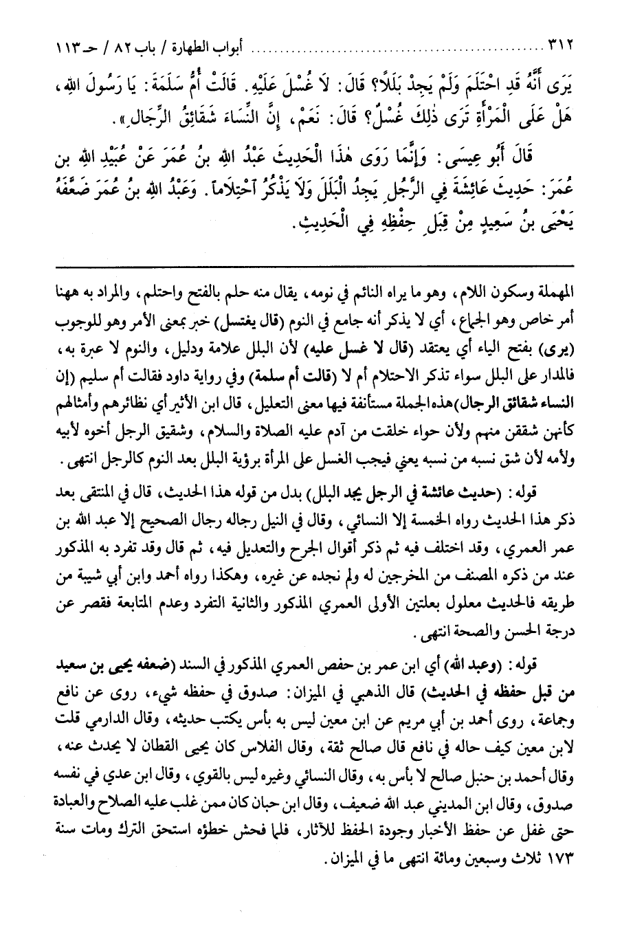 قَوْلُهُ (حَدِيثُ عَائِشَةَ فِي الرَّجُلِ يَجِدُ الْبَلَلَ) بَدَلٌ مِنْ قَوْلِهِ هَذَا الْحَدِيثَ قَالَ فِي الْمُنْتَقَى بَعْدَ ذِكْرِ هَذَا الْحَدِيثِ رَوَاهُ الْخَمْسَةُ إِلَّا النَّسَائِيَّ وَقَالَ فِي النَّيْلِ رِجَالُهُ رِجَالُ الصَّحِيحِ إِلَّا عَبْدَ اللَّهِ بْنَ عُمَرَ الْعُمَرِيَّ وَقَدِ اخْتُلِفَ فِيهِ ثُمَّ ذَكَرَ أَقْوَالَ الْجَرْحِ وَالتَّعْدِيلِ فِيهِ ثُمَّ قَالَ وَقَدْ تَفَرَّدَ بِهِ الْمَذْكُورُ عِنْدَ مَنْ ذَكَرَهُ الْمُصَنِّفُ مِنَ الْمُخَرِّجِينَ لَهُ وَلَمْ نَجِدْهُ عَنْ غَيْرِهِ وَهَكَذَا رواه أحمد وبن أَبِي شَيْبَةَ مِنْ طَرِيقِهِ فَالْحَدِيثُ مَعْلُولٌ بِعِلَّتَيْنِ الْأُولَى الْعُمَرِيُّ الْمَذْكُورُ وَالثَّانِيَةُ التَّفَرُّدُ وَعَدَمُ الْمُتَابَعَةِ فَقَصُرَ عَنْ دَرَجَةِ الْحَسَنِ وَالصِّحَّةِ انْتَهَى