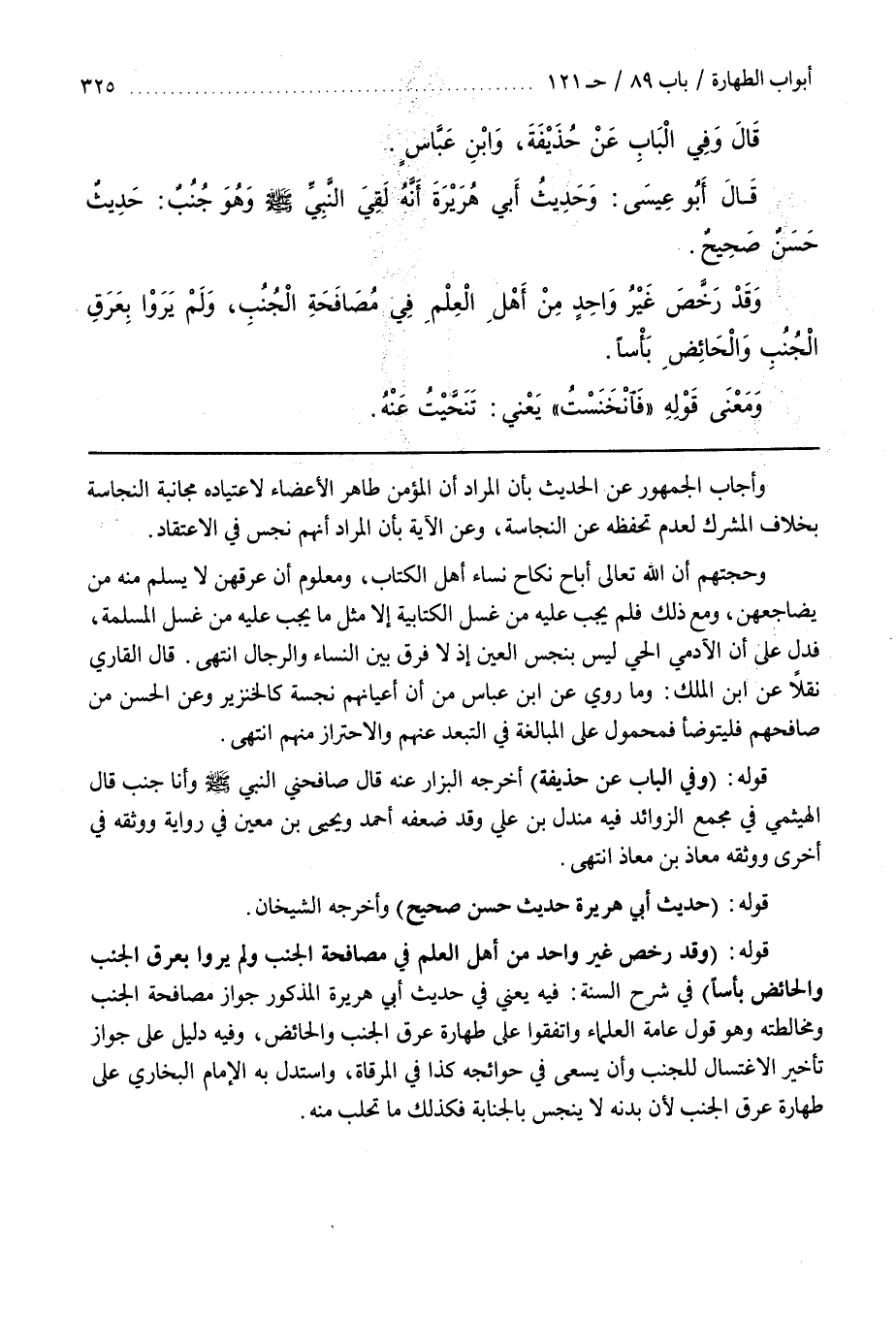 قال القارىء نقلا عن بن الملك وما روي عن بن عَبَّاسٍ مِنْ أَنَّ أَعْيَانَهُمْ نَجِسَةٌ كَالْخِنْزِيرِ وَعَنِ الْحَسَنِ مَنْ صَافَحَهُمْ فَلْيَتَوَضَّأْ فَمَحْمُولٌ عَلَى الْمُبَالَغَةِ فِي التَّبَعُّدِ عَنْهُمْ وَالِاحْتِرَازِ مِنْهُمْ انْتَهَى قَوْلُهُ (وَفِي الْبَابِ عَنْ حُذَيْفَةَ) أَخْرَجَهُ الْبَزَّارُ عَنْهُ قَالَ صَافَحَنِي النَّبِيُّ صَلَّى اللَّهُ عَلَيْهِ وَسَلَّمَ وَأَنَا جُنُبٌ قَالَ الْهَيْثَمِيُّ فِي مَجْمَعِ الزَّوَائِدِ فِيهِ مِنْدَلُ بْنُ عَلِيٍّ وَقَدْ ضَعَّفَهُ أَحْمَدُ وَيَحْيَى بْنُ مَعِينٍ فِي رِوَايَةٍ وَوَثَّقَهُ فِي أُخْرَى وَوَثَّقَهُ مُعَاذُ بْنُ مُعَاذٍ انْتَهَى