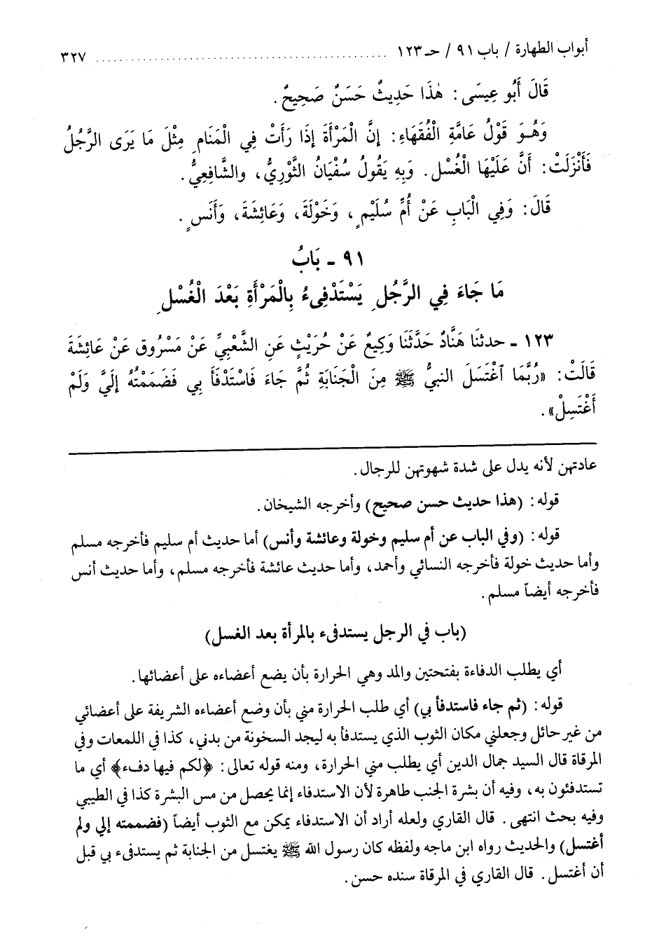 [123] قَوْلُهُ (ثُمَّ جَاءَ فَاسْتَدْفَأَ بِي) أَيْ طَلَبَ الْحَرَارَةَ مِنِّي بِأَنْ وَضَعَ أَعْضَاءَهُ الشَّرِيفَةَ عَلَى أَعْضَائِي مِنْ غَيْرِ حَائِلٍ وَجَعَلَنِي مَكَانَ الثَّوْبِ الَّذِي يُسْتَدْفَأُ بِهِ لِيَجِدَ السُّخُونَةَ مِنْ بدني كذا في اللمعات وفي المرقاة قال السَّيِّدُ جَمَالُ الدِّينِ أَيْ يَطْلُبُ مِنِّي الْحَرَارَةَ وَمِنْهُ قَوْلُهُ تَعَالَى (لَكُمْ فِيهَا دِفْءٌ) أَيْ ما تستدفؤون بِهِ وَفِيهِ أَنَّ بَشَرَةَ الْجُنُبِ طَاهِرَةٌ لِأَنَّ الِاسْتِدْفَاءَ إِنَّمَا يَحْصُلُ مِنْ مَسِّ الْبَشَرَةِ كَذَا في الطيبي وفيه بحث انتهى