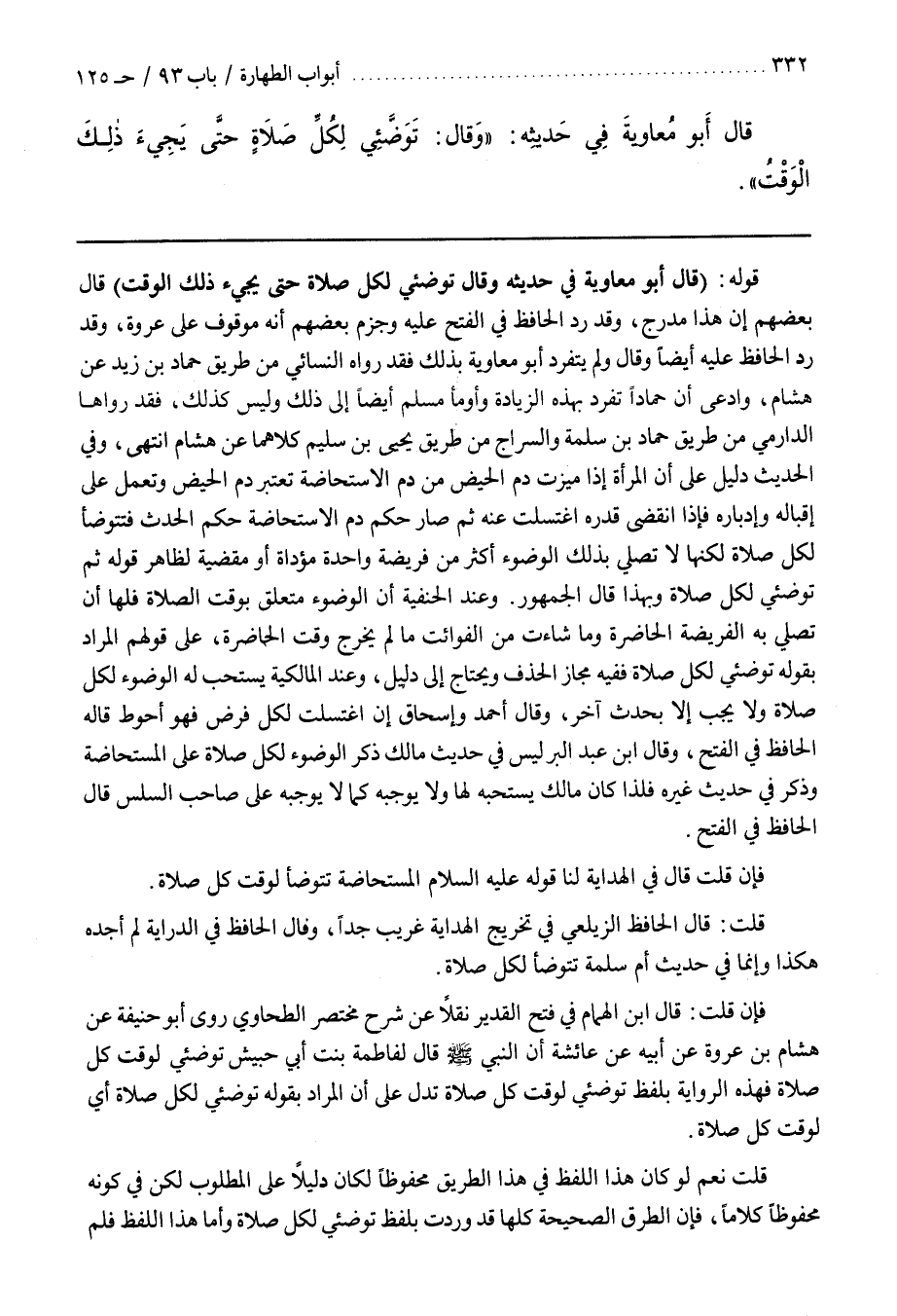 فَإِنْ قُلْتَ قال بن الْهُمَامِ فِي فَتْحِ الْقَدِيرِ نَقْلًا عَنْ شَرْحِ مُخْتَصَرِ الطَّحَاوِيِّ رَوَى أَبُو حَنِيفَةَ عَنْ هِشَامِ بْنِ عُرْوَةَ عَنْ أَبِيهِ عَنْ عَائِشَةَ أَنَّ النَّبِيَّ صَلَّى اللَّهُ عَلَيْهِ وَسَلَّمَ قَالَ لِفَاطِمَةَ بِنْتِ أَبِي حُبَيْشٍ تَوَضَّئِي لِوَقْتِ كُلِّ صَلَاةٍ فَهَذِهِ الرِّوَايَةُ بِلَفْظِ تَوَضَّئِي لِوَقْتِ كُلِّ صَلَاةٍ تَدُلُّ عَلَى أَنَّ الْمُرَادَ بِقَوْلِهِ تَوَضَّئِي لِكُلِّ صلاة أي الوقت كُلِّ صَلَاةٍ