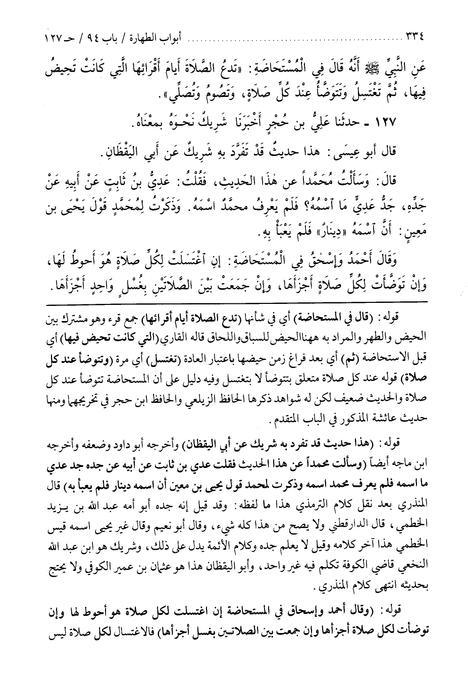 [127] قَوْلُهُ (هَذَا حَدِيثٌ قَدْ تَفَرَّدَ بِهِ شَرِيكٌ عَنْ أَبِي الْيَقِظَانِ) وَأَخْرَجَهُ أبو داود وضعفه وأخرجه بن مَاجَهْ أَيْضًا (وَسَأَلْتُ مُحَمَّدًا عَنْ هَذَا الْحَدِيثِ فَقُلْتُ عَدِيُّ بْنُ ثَابِتٍ عَنْ أَبِيهِ عَنْ جَدِّهِ جَدِّ عَدِيٍّ مَا اسْمُهُ فَلَمْ يَعْرِفْ مُحَمَّدٌ اسْمَهُ وَذَكَرْتُ لِمُحَمَّدٍ قَوْلَ يَحْيَى بْنِ مَعِينٍ أَنَّ اسْمَهُ دِينَارٌ فَلَمْ يَعْبَأْ بِهِ) قَالَ الْمُنْذِرِيُّ بَعْدَ نَقْلِ كَلَامِ التِّرْمِذِيِّ هَذَا مَا لَفْظُهُ وَقَدْ قِيلَ إِنَّهُ جَدُّهُ أَبُو أُمِّهِ عَبْدُ اللَّهِ بْنُ يَزِيدَ الْخَطْمِيُّ قَالَ الدَّارَقُطْنِيُّ وَلَا يَصِحُّ مِنْ هَذَا كُلِّهِ شَيْءٌ وَقَالَ أَبُو نُعَيْمٍ وَقَالَ غَيْرُ يَحْيَى اسْمُهُ قَيْسٌ الْخَطْمِيُّ هَذَا آخِرُ كَلَامِهِ وَقِيلَ لَا يُعْلَمُ جَدُّهُ وَكَلَامُ الْأَئِمَّةِ يَدُلُّ عَلَى ذَلِكَ وشريك هو بن عَبْدِ اللَّهِ النَّخَعِيُّ قَاضِي الْكُوفَةِ تَكَلَّمَ فِيهِ غَيْرُ وَاحِدٍ وَأَبُو الْيَقْظَانِ هَذَا هُوَ عُثْمَانُ بْنُ عُمَيْرٍ الْكُوفِيُّ وَلَا يُحْتَجُّ بِحَدِيثِهِ انْتَهَى كَلَامُ الْمُنْذِرِيِّ