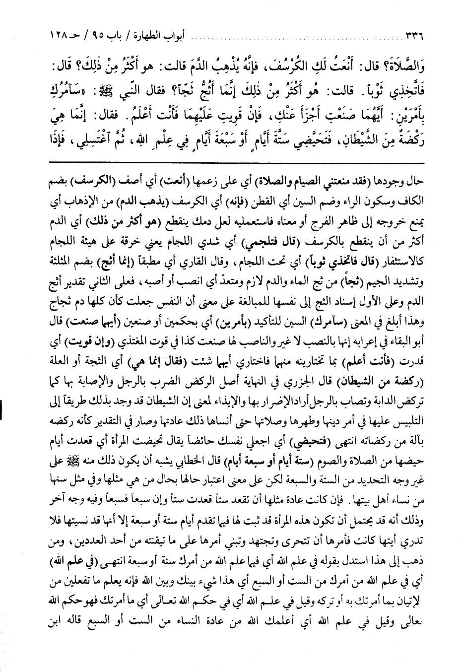 حَالِ وُجُودِهَا (فَقَدْ مَنَعَتْنِي الصِّيَامَ وَالصَّلَاةَ) أَيْ عَلَى زَعْمِهَا (أَنْعَتُ) أَيْ أَصِفُ (الْكُرْسُفَ) بِضَمِّ الْكَافِ وَسُكُونِ الرَّاءِ وَضَمِّ السِّينِ أَيِ الْقُطْنَ (فَإِنَّهُ) أَيِ الْكُرْسُفَ (يُذْهِبُ الدَّمَ) مِنَ الْإِذْهَابِ أَيْ يَمْنَعُ خُرُوجَهُ إِلَى ظَاهِرِ الْفَرْجِ أَوْ مَعْنَاهُ فَاسْتَعْمِلِيهِ لَعَلَّ دَمَكِ يَنْقَطِعُ (هُوَ أَكْثَرُ مِنْ ذَلِكَ) أَيِ الدَّمُ أَكْثَرُ مِنْ أَنْ يَنْقَطِعَ بِالْكُرْسُفِ (قَالَ فَتَلَجَّمِي) أَيْ شُدِّي اللِّجَامَ يَعْنِي خِرْقَةً عَلَى هَيْئَةِ اللِّجَامِ كَالِاسْتِثْفَارِ (قَالَ فاتخذي ثوبا) أي تحت اللجام وقال القارىء أَيْ مُطْبِقًا (إِنَّمَا أَثُجُّ) بِضَمِّ الْمُثَلَّثَةِ وَتَشْدِيدِ الْجِيمِ (ثَجًّا) مِنْ ثَجَّ الْمَاءُ وَالدَّمُ لَازِمٌ ومتعدي أي أنصب أو أصبه فعلى الثاني تقديره أَثُجُّ الدَّمَ وَعَلَى الْأَوَّلِ إِسْنَادُ الثَّجِّ إِلَى نَفْسِهَا لِلْمُبَالَغَةِ عَلَى مَعْنَى أَنَّ النَّفْسَ جُعِلَتْ كَأَنَّ كُلَّهَا دَمٌ ثَجَّاجٌ وَهَذَا أَبْلَغُ فِي الْمَعْنَى (سَآمُرُكِ) السِّينُ لِلتَّأْكِيدِ (بِأَمْرَيْنِ) أَيْ بِحُكْمَيْنِ أَوْ صِنْفَيْنِ (أَيَّهُمَا صَنَعْتِ) قَالَ أَبُو الْبَقَاءِ فِي إِعْرَابِهِ إِنَّهَا بِالنَّصْبِ لَا غَيْرُ وَالنَّاصِبُ لَهَا صَنَعْتِ كَذَا فِي قُوتِ الْمُغْتَذِي (وَإِنْ قَوِيتِ) أَيْ قَدَرْتِ (فَأَنْتِ أَعْلَمُ) بِمَا تَخْتَارِينَهُ مِنْهُمَا فَاخْتَارِي أَيَّهمَا شِئْتِ (فَقَالَ إِنَّمَا هِيَ) أي الثجة أو العلة (ركضة من مِنَ الشَّيْطَانِ) قَالَ الْجَزَرِيُّ فِي النِّهَايَةِ أَصْلُ الرَّكْضِ الضَّرْبُ بِالرِّجْلِ وَالْإِصَابَةُ بِهَا كَمَا تَرْكُضُ الدَّابَّةُ وَتُصَابُ بِالرِّجْلِ أَرَادَ الْإِضْرَارَ بِهَا وَالْإِيذَاءَ لِمَعْنَى إِنَّ الشَّيْطَانَ قَدْ وَجَدَ بِذَلِكَ طَرِيقًا إِلَى التَّلْبِيسِ عَلَيْهَا فِي أَمْرِ دِينِهَا وَطُهْرِهَا وَصَلَاتِهَا حَتَّى أَنْسَاهَا ذَلِكَ عَادَتَهَا وَصَارَ فِي التَّقْدِيرِ كَأَنَّهُ رَكَضَهُ بِآلَةٍ مِنْ رَكَضَاتِهِ انْتَهَى (فَتَحَيَّضِي) أَيِ اجْعَلِي نَفْسَكِ حَائِضًا يُقَالُ تَحَيَّضَتِ الْمَرْأَةُ أَيْ قَعَدَتْ أَيَّامَ حَيْضِهَا مِنَ الصَّلَاةِ وَالصَّوْمِ (سِتَّةَ أَيَّامٍ أَوْ سَبْعَةَ أَيَّامٍ) قَالَ الْخَطَّابِيُّ يُشْبِهُ أَنْ يَكُونَ ذَلِكَ مِنْهُ صَلَّى اللَّهُ عَلَيْهِ وَسَلَّمَ عَلَى غَيْرِ وَجْهِ التَّحْدِيدِ مِنَ السِّتَّةِ وَالسَّبْعَةِ لَكِنْ عَلَى مَعْنَى اعْتِبَارِ حَالِهَا بِحَالِ مَنْ هِيَ مِثْلُهَا وَفِي مِثْلِ سِنِّهَا مِنْ نِسَاءِ أَهْلِ بَيْتِهَا