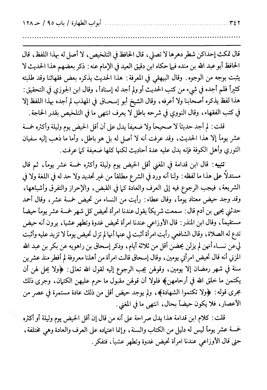 قلت كلام بن قُدَامَةَ هَذَا يَدُلُّ صَرَاحَةً عَلَى أَنَّهُ مَنْ قَالَ إِنَّ أَقَلَّ الْحَيْضِ يَوْمٌ وَلَيْلَةٌ أَوْ أَكْثَرُهُ خَمْسَةَ عَشَرَ يَوْمًا لَيْسَ لَهُ دَلِيلٌ مِنَ الْكِتَابِ وَالسُّنَّةِ وَإِنَّمَا اعْتِمَادُهُ عَلَى الْعُرْفِ وَالْعَادَةِ وَهِيَ مُخْتَلِفَةٌ حَتَّى قَالَ الْأَوْزَاعِيُّ عِنْدَنَا امْرَأَةٌ تَحِيضُ غَدْوَةً وَتَطْهُرُ عَشِيًّا فَتَفَكَّرْ