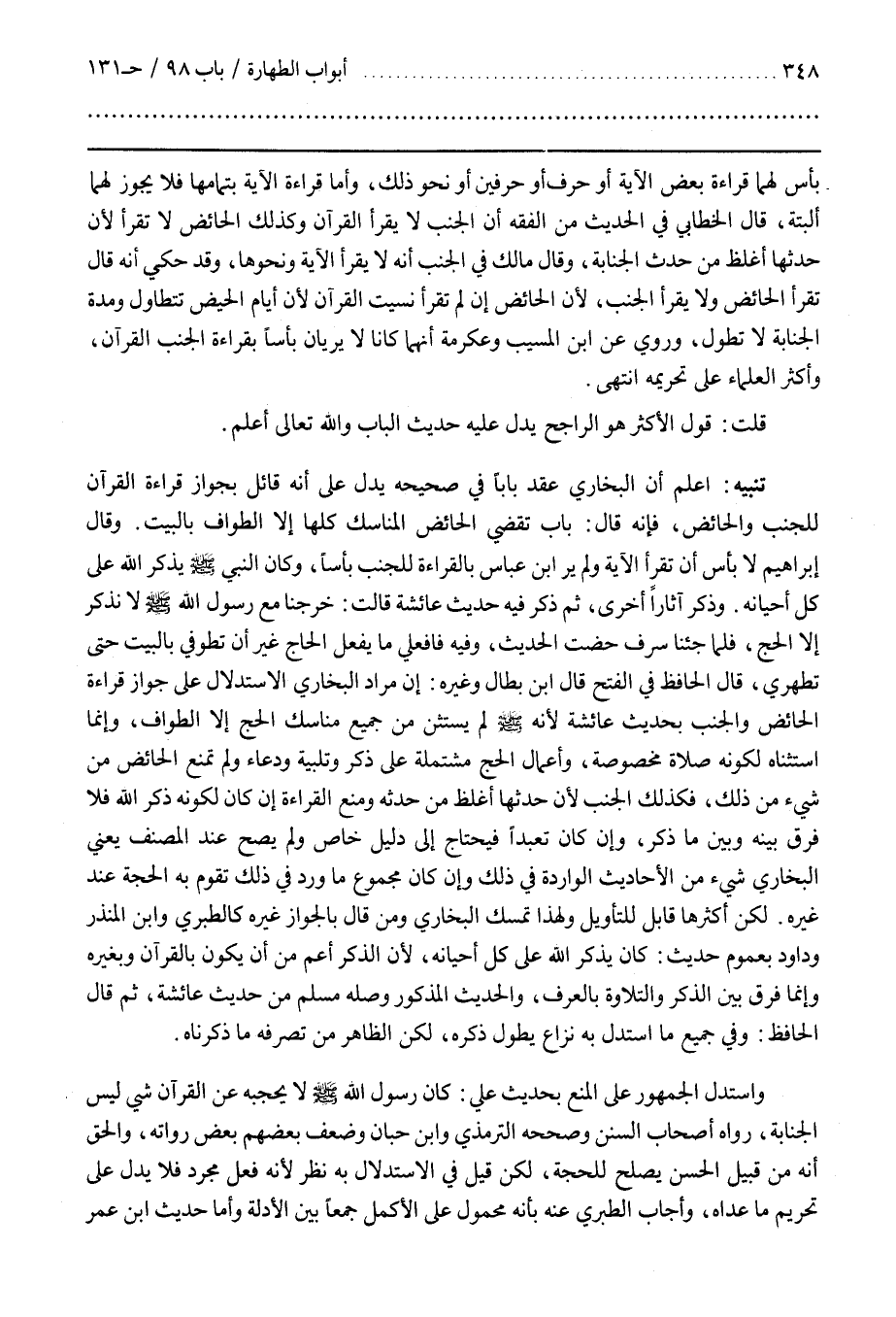 لَكِنَّ أَكْثَرَهَا قَابِلٌ لِلتَّأْوِيلِ وَلِهَذَا تَمَسَّكَ الْبُخَارِيُّ وَمَنْ قَالَ بالجواز غيره كالطبري وبن الْمُنْذِرِ وَدَاوُدُ بِعُمُومِ حَدِيثِ كَانَ يَذْكُرُ اللَّهَ عَلَى كُلِّ أَحْيَانِهِ لِأَنَّ الذِّكْرَ أَعَمُّ مِنْ أَنْ يَكُونَ بِالْقُرْآنِ وَبِغَيْرِهِ وَإِنَّمَا فُرِّقَ بَيْنَ الذِّكْرِ وَالتِّلَاوَةِ بِالْعُرْفِ وَالْحَدِيثُ الْمَذْكُورُ وَصَلَهُ مُسْلِمٌ مِنْ حَدِيثِ عَائِشَةَ ثُمَّ قَالَ الْحَافِظُ وَفِي جَمِيعِ مَا اسْتَدَلَّ بِهِ نِزَاعٌ يَطُولُ ذِكْرُهُ لَكِنَّ الظَّاهِرَ مِنْ تَصَرُّفِهِ مَا ذَكَرْنَاهُ