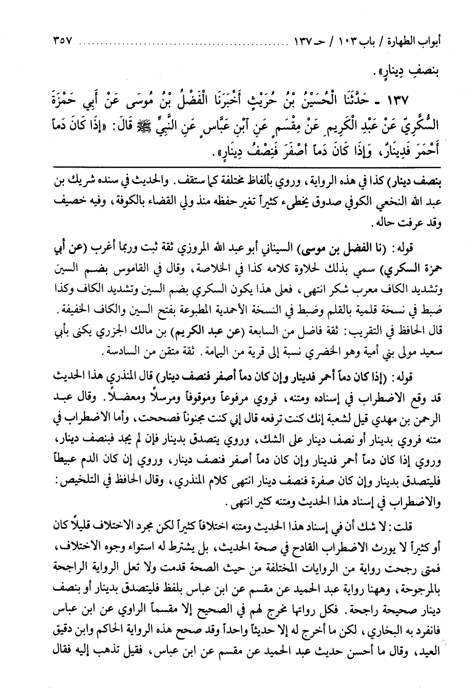 وَقَالَ عَبْدُ الرَّحْمَنِ بْنُ مَهْدِيٍّ قِيلَ لِشُعْبَةَ إِنَّكَ كُنْتَ تَرْفَعُهُ قَالَ إِنِّي كُنْتُ مَجْنُونًا فَصَحَحْتُ وَأَمَّا الِاضْطِرَابُ فِي مَتْنِهِ فَرُوِيَ بِدِينَارٍ أَوْ نِصْفِ دِينَارٍ عَلَى الشَّكِّ وَرُوِيَ يَتَصَدَّقُ بِدِينَارٍ فَإِنْ لَمْ يَجِدْ فَبِنِصْفِ دِينَارٍ وَرُوِيَ إِذَا كَانَ دَمًا أَحْمَرَ فَدِينَارٌ وَإِنْ كَانَ دَمًا أَصْفَرَ فَنِصْفُ دِينَارٍ وَرُوِيَ إِنْ كَانَ الدَّمُ عَبِيطًا فَلْيَتَصَدَّقْ بِدِينَارٍ وَإِنْ كَانَ صُفْرَةً فَنِصْفُ دِينَارٍ انْتَهَى كَلَامُ الْمُنْذِرِيِّ وَقَالَ الْحَافِظُ فِي التَّلْخِيصِ وَالِاضْطِرَابُ فِي إِسْنَادِ هَذَا الْحَدِيثِ وَمَتْنِهِ كَثِيرٌ انْتَهَى قُلْتُ لا شك في أن إِسْنَادِ هَذَا الْحَدِيثِ وَمَتْنِهِ اخْتِلَافًا كَثِيرًا لَكِنَّ مُجَرَّدَ الِاخْتِلَافِ قَلِيلًا كَانَ أَوْ كَثِيرًا لَا يُورِثُ الِاضْطِرَابَ الْقَادِحَ فِي صِحَّةِ الْحَدِيثِ بَلْ يُشْتَرَطُ لَهُ اسْتِوَاءُ وُجُوهِ الِاخْتِلَافِ فَمَتَى رُجِّحَتْ رِوَايَةٌ مِنَ الرِّوَايَاتِ الْمُخْتَلِفَةِ مِنْ حَيْثُ الصِّحَّةُ قدمت ولا تعل الرواية الراجحة بالمرجوحة وههنا رواية عبد الحميد عن مقسم عن بن عَبَّاسٍ بِلَفْظِ فَلْيَتَصَدَّقْ بِدِينَارٍ أَوْ بِنِصْفِ دِينَارٍ صَحِيحَةٌ رَاجِحَةٌ