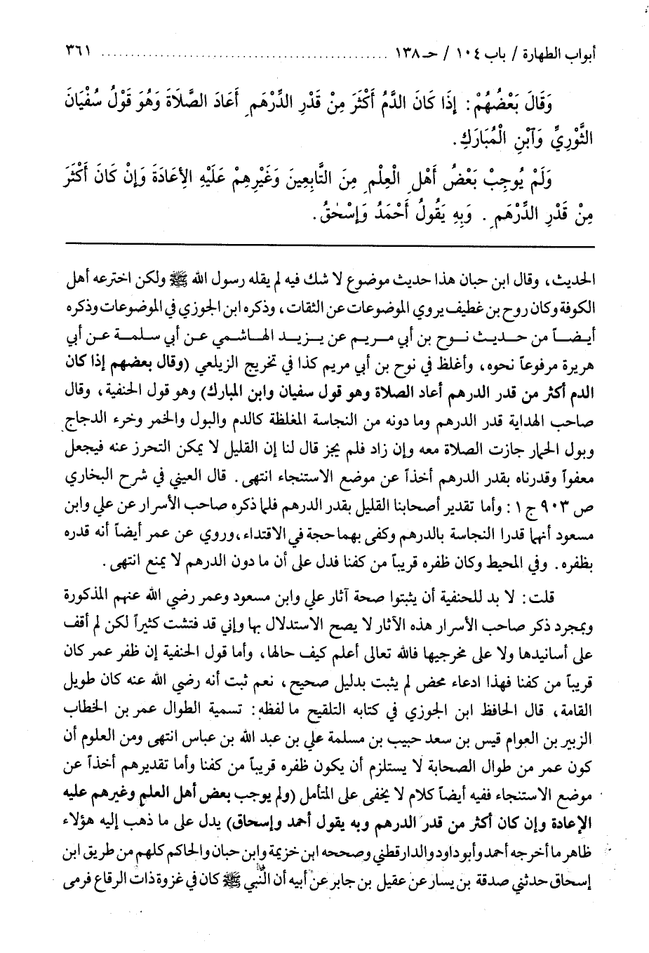 الحديث وقال بن حِبَّانَ هَذَا حَدِيثٌ مَوْضُوعٌ لَا شَكَّ فِيهِ لَمْ يَقُلْهُ رَسُولُ اللَّهِ صَلَّى اللَّهُ عَلَيْهِ وَسَلَّمَ وَلَكِنِ اخْتَرَعَهُ أَهْلُ الْكُوفَةِ وَكَانَ رَوْحُ بْنُ غَطِيفٍ يَرْوِي الْمَوْضُوعَاتِ عَنِ الثِّقَاتِ وَذَكَرَهُ بن الْجَوْزِيِّ فِي الْمَوْضُوعَاتِ وَذَكَرَهُ أَيْضًا مِنْ حَدِيثِ نُوحِ بْنِ أَبِي مَرْيَمَ عَنْ يَزِيدَ الْهَاشِمِيِّ عَنْ أَبِي سَلَمَةَ عَنْ أَبِي هُرَيْرَةَ مَرْفُوعًا نَحْوَهُ وَأَغْلَظَ فِي نُوحِ بْنِ أَبِي مَرْيَمَ كَذَا فِي تَخْرِيجِ الزَّيْلَعِيِّ (وَقَالَ بَعْضُهُمْ إِذَا كَانَ الدَّمُ أَكْثَرَ مِنْ قَدْرِ الدِّرْهَمِ أَعَادَ الصلاة وهو قول سفيان وبن الْمُبَارَكِ) وَهُوَ قَوْلُ الْحَنَفِيَّةِ وَقَالَ صَاحِبُ الْهِدَايَةِ قَدْرُ الدِّرْهَمِ وَمَا دُونَهُ مِنَ النَّجَاسَةِ الْمُغَلَّظَةِ كَالدَّمِ وَالْبَوْلِ وَالْخَمْرِ وَخَرْءِ الدَّجَاجِ وَبَوْلِ الْحِمَارِ جَازَتِ الصَّلَاةُ مَعَهُ وَإِنْ زَادَ فَلَمْ يَجُزْ قَالَ لَنَا إِنَّ الْقَلِيلَ لَا يُمْكِنُ التَّحَرُّزُ عَنْهُ فَيُجْعَلُ مَعْفُوًّا وَقَدَّرْنَاهُ بِقَدْرِ الدِّرْهَمِ أَخْذًا عَنْ مَوْضِعِ الِاسْتِنْجَاءِ انْتَهَى