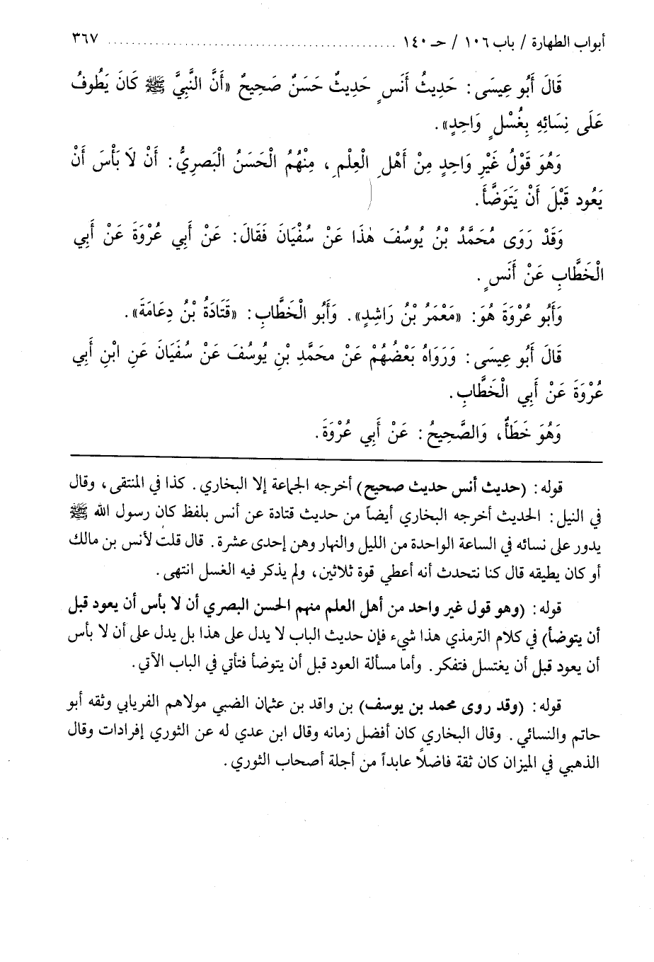 قَوْلُهُ (وَهُوَ قَوْلُ غَيْرِ وَاحِدٍ مِنْ أَهْلِ الْعِلْمِ مِنْهُمِ الْحَسَنُ الْبَصْرِيُّ أَنْ لَا بَأْسَ أَنْ يَعُودَ قَبْلَ أَنْ يَتَوَضَّأَ) فِي كَلَامِ التِّرْمِذِيِّ هَذَا شَيْءٌ فَإِنَّ حَدِيثَ الْبَابِ لَا يَدُلُّ عَلَى هَذَا بَلْ يَدُلُّ عَلَى أَنْ لَا بَأْسَ أَنْ يَعُودَ قَبْلَ أَنْ يَغْتَسِلَ فَتَفَكَّرْ