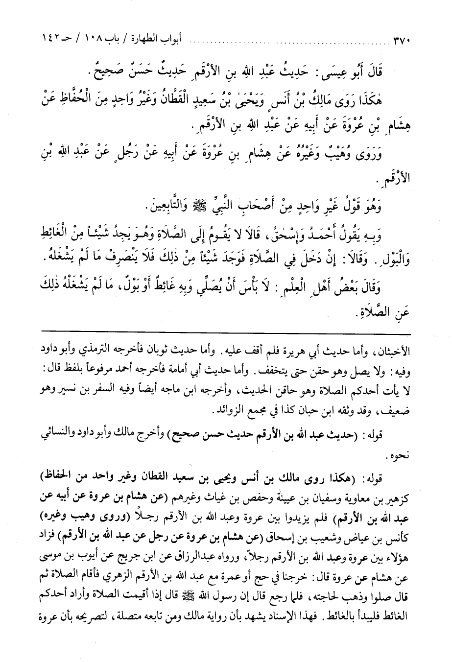 قَوْلُهُ (هَكَذَا رَوَى مَالِكُ بْنُ أَنَسٍ وَيَحْيَى بْنُ سَعِيدٍ الْقَطَّانُ وَغَيْرُ وَاحِدٍ مِنَ الْحُفَّاظِ) كَزُهَيْرِ بْنِ مُعَاوِيَةَ وَسُفْيَانَ بْنِ عُيَيْنَةَ وَحَفْصِ بْنِ غِيَاثٍ وَغَيْرِهِمْ (عَنْ هِشَامِ بْنِ عُرْوَةَ عَنْ أَبِيهِ عَنْ عَبْدِ اللَّهِ بْنِ الْأَرْقَمِ) فَلَمْ يَزِيدُوا بَيْنَ عُرْوَةَ وَعَبْدِ اللَّهِ بْنِ الْأَرْقَمِ رَجُلًا (وَرَوَى وُهَيْبٌ وَغَيْرُهُ) كَأَنَسِ بْنِ عِيَاضٍ وَشُعَيْبِ بْنِ إِسْحَاقَ (عَنْ هِشَامِ بْنِ عُرْوَةَ عَنْ رَجُلٍ عَنْ عَبْدِ اللَّهِ بْنِ الْأَرْقَمِ) فَزَادَ هَؤُلَاءِ بَيْنَ عُرْوَةَ وَعَبْدِ اللَّهِ بْنِ الأرقم رجلا ورواه عبد الرزاق عن بن جُرَيْجٍ عَنْ أَيُّوبِ بْنِ مُوسَى عَنْ هِشَامٍ عَنْ عُرْوَةَ قَالَ خَرَجْنَا فِي حَجٍّ أَوْ عُمَرَةٍ مَعَ عَبْدِ اللَّهِ بْنِ الْأَرْقَمِ الزُّهْرِيِّ فَأَقَامَ الصَّلَاةَ ثُمَّ قَالَ صَلُّوا وَذَهَبَ لِحَاجَتِهِ فَلَمَّا رَجَعَ قَالَ إِنَّ رَسُولَ اللَّهِ صَلَّى اللَّهُ عَلَيْهِ وَسَلَّمَ قَالَ إِذَا أُقِيمَتِ الصَّلَاةُ وَأَرَادَ أَحَدُكُمِ الْغَائِطَ فَلْيَبْدَأْ بِالْغَائِطِ