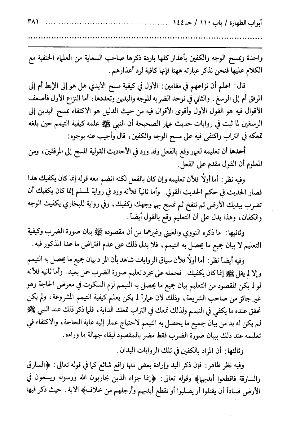 وَالثَّانِي فِي تَوَحُّدِ الضَّرْبَةِ لِلْوَجْهِ وَالْيَدَيْنِ وَتَعَدُّدِهَا أَمَّا النِّزَاعُ الْأَوَّلُ فَأَضْعَفُ الْأَقْوَالِ فِيهِ هُوَ الْقَوْلُ الْأَوَّلُ وَأَقْوَى الْأَقْوَالِ فِيهِ مِنْ حَيْثُ الدَّلِيلُ هُوَ الِاكْتِفَاءُ بِمَسْحِ الْيَدَيْنِ إِلَى الرُّسْغَيْنِ لِمَا ثَبَتَ فِي رِوَايَاتِ حَدِيثِ عَمَّارٍ الصَّحِيحَةِ أَنَّ النَّبِيَّ صَلَّى اللَّهُ عَلَيْهِ وَسَلَّمَ عَلَّمَهُ كَيْفِيَّةَ التَّيَمُّمِ حِينَ بَلَغَهُ تَمَعُّكُهُ فِي التُّرَابِ وَاكْتَفَى فِيهِ عَلَى مَسْحِ الْوَجْهِ وَالْكَفَّيْنِ قَالَ وَأُجِيبَ عَنْهُ بِوُجُوهٍ أَحَدُهَا أَنَّ تَعْلِيمَهُ لِعَمَّارٍ وَقَعَ بِالْفِعْلِ وَقَدْ وَرَدَ فِي الْأَحَادِيثِ الْقَوْلِيَّةِ الْمَسْحُ إِلَى الْمِرْفَقَيْنِ وَمِنَ الْمَعْلُومِ أَنَّ الْقَوْلَ مُقَدَّمٌ عَلَى الْفِعْلِ