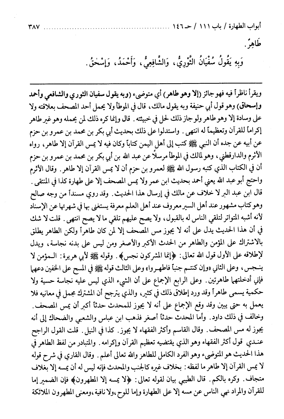 قُلْتُ لَا شَكَّ فِي أَنَّ هَذَا الْحَدِيثَ يَدُلُّ عَلَى أَنَّهُ لَا يَجُوزُ مَسُّ الْمُصْحَفِ إِلَّا لِمَنْ كَانَ طَاهِرًا وَلَكِنَّ الطَّاهِرَ يُطْلَقُ بِالِاشْتِرَاكِ عَلَى الْمُؤْمِنِ وَالطَّاهِرِ مِنَ الْحَدَثِ الْأَكْبَرِ وَالْأَصْغَرِ وَمَنْ لَيْسَ عَلَى بَدَنِهِ نَجَاسَةٌ وَيَدُلُّ لِإِطْلَاقِهِ عَلَى الْأَوَّلِ قَوْلُ اللَّهِ تعالى إنما المشركون نجس وَقَوْلُهُ صَلَّى اللَّهُ عَلَيْهِ وَسَلَّمَ لِأَبِي هُرَيْرَةَ الْمُؤْمِنُ لَا يَنْجُسُ وَعَلَى الثَّانِي وَإِنْ كُنْتُمْ جنبا فاطهروا وَعَلَى الثَّالِثِ قَوْلُهُ صَلَّى اللَّهُ عَلَيْهِ وَسَلَّمَ فِي الْمَسْحِ عَلَى الْخُفَّيْنِ دَعْهُمَا فَإِنِّي أَدْخَلَتْهُمَا طَاهِرَتَيْنِ