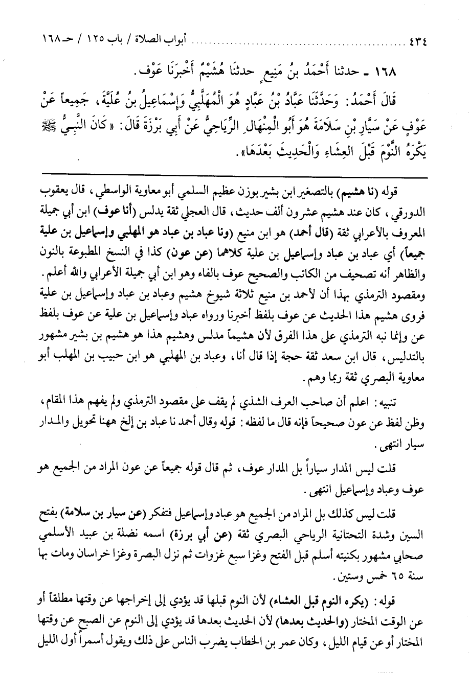 [168] قوله (نا هشيم) بالتصغير بن بَشِيرٍ بِوَزْنِ عَظِيمٍ السُّلَمِيُّ أَبُو مُعَاوِيَةَ الْوَاسِطِيُّ قَالَ يَعْقُوبُ الدَّوْرَقِيُّ كَانَ عِنْدَ هُشَيْمٍ عِشْرُونَ أَلْفَ حَدِيثٍ قَالَ الْعِجْلِيُّ ثِقَةٌ يُدَلِّسُ (أَنَا عَوْفُ) بْنُ أَبِي جَمِيلَةَ الْمَعْرُوفُ بِالْأَعْرَابِيِّ ثِقَةٌ (قال أحمد) هو بن مَنِيعٍ (وَنَا عَبَّادُ بْنُ عَبَّادِ هُوَ الْمُهَلَّبِيُّ وَإِسْمَاعِيلُ بْنُ عُلَيَّةَ جَمِيعًا) أَيْ عَبَّادُ بْنُ عباد وإسماعيل بن عُلَيَّةَ كِلَاهُمَا (عَنْ عَوْنٍ) كَذَا فِي النُّسَخِ الْمَطْبُوعَةِ بِالنُّونِ وَالظَّاهِرُ أَنَّهُ تَصْحِيفٌ مِنَ الْكَاتِبِ والصحيح عوف بالفاء وهو بن أَبِي جَمِيلَةَ الْأَعْرَابِيُّ وَاَللَّهُ أَعْلَمُ