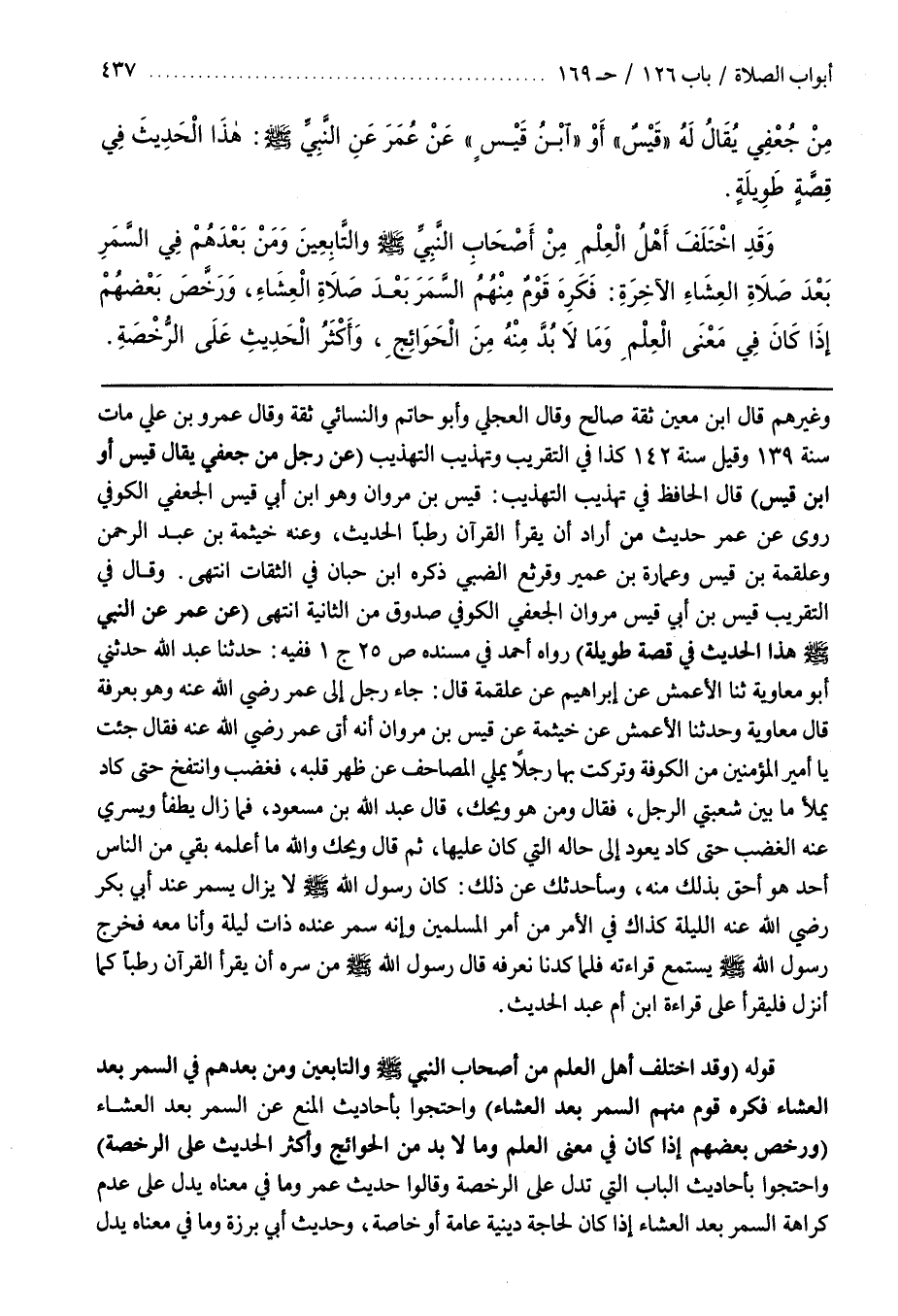 قَوْلُهُ (وَقَدِ اخْتَلَفَ أَهْلُ الْعِلْمِ مِنْ أَصْحَابِ النَّبِيِّ صَلَّى اللَّهُ عَلَيْهِ وَسَلَّمَ وَالتَّابِعِينَ وَمَنْ بَعْدَهُمْ فِي السَّمَرِ بَعْدَ الْعِشَاءِ فَكَرِهَ قَوْمٌ مِنْهُمُ السَّمَرَ بَعْدَ الْعِشَاءِ) وَاحْتَجُّوا بِأَحَادِيثِ الْمَنْعِ عَنِ السَّمَرِ بَعْدَ الْعِشَاءِ (وَرَخَّصَ بَعْضُهُمْ إِذَا كَانَ فِي مَعْنَى الْعِلْمِ وَمَا لَا بُدَّ مِنَ الْحَوَائِجِ وَأَكْثَرُ الْحَدِيثِ عَلَى الرُّخْصَةِ) وَاحْتَجُّوا بِأَحَادِيثِ الْبَابِ الَّتِي تَدُلُّ عَلَى الرُّخْصَةِ وَقَالُوا حَدِيثُ عُمَرَ وَمَا فِي مَعْنَاهُ يَدُلُّ عَلَى عَدَمِ كَرَاهَةِ السَّمَرِ بَعْدَ الْعِشَاءِ إِذَا كَانَ لِحَاجَةٍ دِينِيَّةٍ عَامَّةٍ أَوْ خَاصَّةٍ وَحَدِيثُ أَبِي بَرْزَةَ وَمَا فِي مَعْنَاهُ يدل