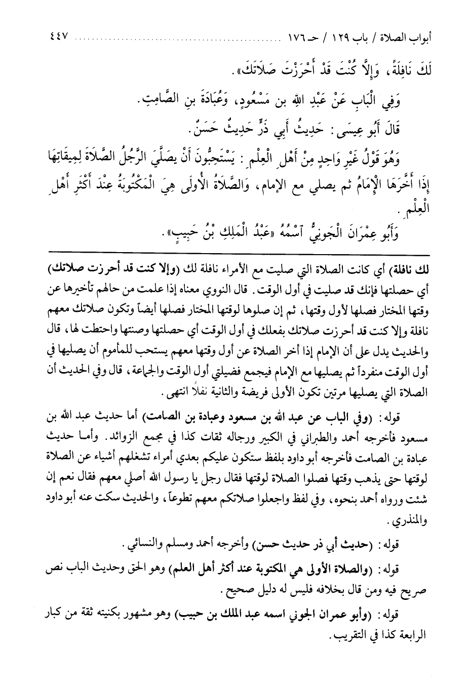 قَوْلُهُ (وَالصَّلَاةُ الْأُولَى هِيَ الْمَكْتُوبَةُ عِنْدَ أَكْثَرِ أَهْلِ العلم) وهوالحق وَحَدِيثُ الْبَابِ نَصٌّ صَرِيحٌ فِيهِ وَمَنْ قَالَ بِخِلَافِهِ فَلَيْسَ لَهُ دَلِيلٌ صَحِيحٌ