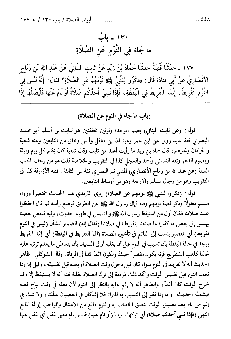 قَوْلُهُ (ذَكَرُوا لِلنَّبِيِّ صَلَّى اللَّهُ عَلَيْهِ وَسَلَّمَ نَوْمَهُمْ عَنِ الصَّلَاةِ) رَوَى التِّرْمِذِيُّ هَذَا الْحَدِيثَ مُخْتَصَرًا وَرَوَاهُ مُسْلِمٌ مُطَوَّلًا وَذَكَرَ قِصَّةَ نَوْمِهِمْ وَفِيهِ فَمَالَ رَسُولُ اللَّهِ صَلَّى اللَّهُ عَلَيْهِ وَسَلَّمَ عَنِ الطَّرِيقِ فَوَضَعَ رَأْسَهُ ثُمَّ قَالَ احْفَظُوا عَلَيْنَا صَلَاتَنَا فَكَانَ أَوَّلَ مَنِ اسْتَيْقَظَ رَسُولُ اللَّهِ صَلَّى اللَّهُ عَلَيْهِ وَسَلَّمَ وَالشَّمْسُ فِي ظَهْرِهِ الْحَدِيثَ وَفِيهِ فَجَعَلَ بَعْضُنَا يَهْمِسُ إِلَى بَعْضٍ مَا كَفَّارَةُ مَا صَنَعْنَا بِتَفْرِيطِنَا فِي صَلَاتِنَا (فَقَالَ إِنَّهُ) الضَّمِيرُ لِلشَّأْنِ (لَيْسَ فِي النَّوْمِ تَفْرِيطٌ) أَيْ تَقْصِيرٌ يُنْسَبُ إِلَى النَّائِمِ فِي تَأْخِيرِهِ الصَّلَاةَ (إِنَّمَا التَّفْرِيطُ فِي الْيَقَظَةِ) أَيْ إِنَّمَا التَّفْرِيطُ يُوجَدُ فِي حَالَةِ الْيَقَظَةِ بِأَنْ تَسَبَّبَ فِي النَّوْمِ قَبْلَ أَنْ يَغْلِبَهُ أَوْ فِي النِّسْيَانِ بِأَنْ يَتَعَاطَى مَا يَعْلَمُ تَرَتُّبَهُ عَلَيْهِ غَالِبًا كَلَعِبِ الشِّطْرَنْجِ فَإِنَّهُ يَكُونُ مُقَصِّرًا حِينَئِذٍ وَيَكُونُ آثِمًا كَذَا فِي الْمِرْقَاةِ