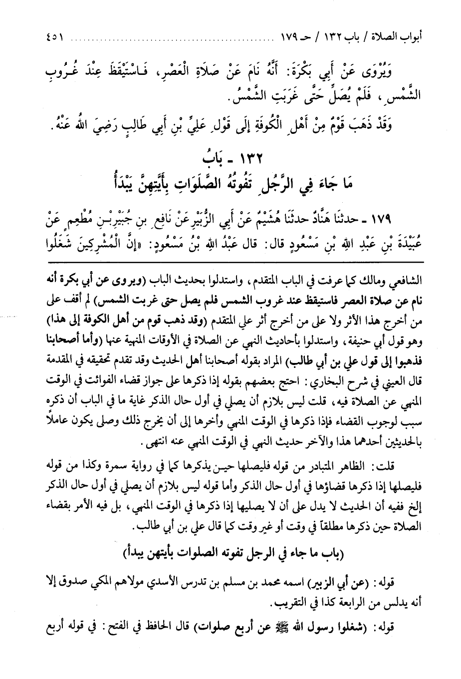 الشَّافِعِيِّ وَمَالِكٍ كَمَا عَرَفْتَ فِي الْبَابِ الْمُتَقَدِّمِ وَاسْتَدَلُّوا بِحَدِيثِ الْبَابِ (وَيُرْوَى عَنْ أَبِي بَكْرَةَ أَنَّهُ نَامَ عَنْ صَلَاةِ الْعَصْرِ فَاسْتَيْقَظَ عِنْدَ غُرُوبِ الشَّمْسِ فَلَمْ يُصَلِّ حَتَّى غَرَبَتِ الشَّمْسُ) لَمْ أَقِفْ عَلَى مَنْ أَخْرَجَ هَذَا الْأَثَرَ وَلَا عَلَى مَنْ أَخْرَجَ أَثَرَ عَلِيٍّ الْمُتَقَدِّمَ (وَقَدْ ذَهَبَ قَوْمٌ مِنْ أَهْلِ الْكُوفَةِ إِلَى هَذَا) وَهُوَ قَوْلُ أَبِي حَنِيفَةَ وَاسْتَدَلُّوا بِأَحَادِيثِ النَّهْيِ عَنِ الصَّلَاةِ فِي الْأَوْقَاتِ الْمَنْهِيَّةِ عَنْهَا (وَأَمَّا أَصْحَابُنَا فَذَهَبُوا إِلَى قَوْلِ عَلِيِّ بْنِ أَبِي طَالِبٍ) الْمُرَادُ بِقَوْلِهِ أَصْحَابُنَا أَهْلُ الْحَدِيثِ وَقَدْ تَقَدَّمَ تَحْقِيقُهُ فِي الْمُقَدِّمَةِ قَالَ الْعَيْنِيُّ فِي شَرْحِ الْبُخَارِيِّ احْتَجَّ بَعْضُهُمْ بِقَوْلِهِ إِذَا ذَكَرَهَا عَلَى جَوَازِ قَضَاءِ الْفَوَائِتِ فِي الْوَقْتِ الْمَنْهِيِّ عَنِ الصَّلَاةِ فِيهِ قُلْتُ لَيْسَ بِلَازِمٍ أَنْ يُصَلِّيَ فِي أَوَّلِ حَالِ الذِّكْرِ غَايَةُ مَا فِي الْبَابِ أَنَّ ذِكْرَهُ سَبَبٌ لِوُجُوبِ الْقَضَاءِ فَإِذَا ذَكَرَهَا فِي الْوَقْتِ الْمَنْهِيِّ وَأَخَّرَهَا إِلَى أَنْ يَخْرُجَ ذَلِكَ وَصَلَّى يَكُونُ عَامِلًا بِالْحَدِيثَيْنِ أَحَدُهُمَا هَذَا وَالْآخَرُ حَدِيثُ النَّهْيِ فِي الْوَقْتِ الْمَنْهِيِّ عَنْهُ انْتَهَى