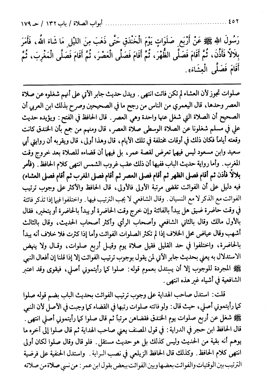 وَأَمَّا رِوَايَةُ حَدِيثِ الْبَابِ فَفِيهَا أَنَّ ذَلِكَ عَقِبَ غُرُوبِ الشَّمْسِ انْتَهَى كَلَامُ الْحَافِظِ (فَأَمَرَ بِلَالًا فَأَذَّنَ ثُمَّ أَقَامَ فَصَلَّى الظُّهْرَ ثُمَّ أَقَامَ فَصَلَّى الْعَصْرَ ثُمَّ أَقَامَ فَصَلَّى الْمَغْرِبَ ثُمَّ أَقَامَ فَصَلَّى الْعِشَاءَ) فِيهِ دَلِيلٌ عَلَى أَنَّ الْفَوَائِتَ تُقْضَى مُرَتَّبَةً الْأُولَى فَالْأُولَى قَالَ الْحَافِظُ وَالْأَكْثَرُ عَلَى وُجُوبِ تَرْتِيبِ الْفَوَائِتِ مَعَ الذِّكْرِ لَا مَعَ النِّسْيَانِ