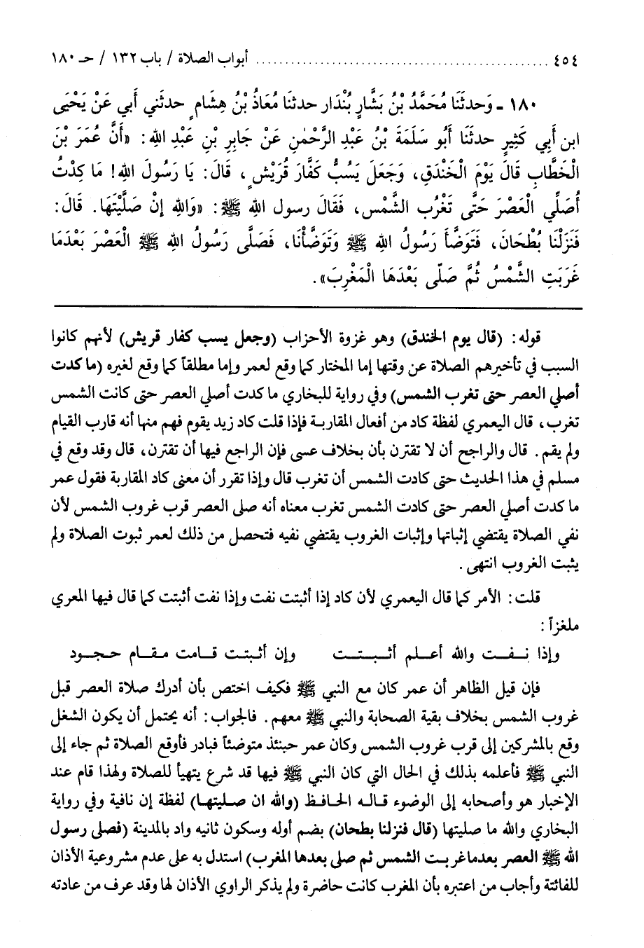 [180] قَوْلُهُ (قَالَ يَوْمَ الْخَنْدَقِ) وَهُوَ غَزْوَةُ الْأَحْزَابِ (وَجَعَلَ يَسُبُّ كُفَّارَ قُرَيْشٍ) لِأَنَّهُمْ كَانُوا السَّبَبَ فِي تَأْخِيرِهِمُ الصَّلَاةَ عَنْ وَقْتِهَا إِمَّا الْمُخْتَارُ كَمَا وَقَعَ لِعُمَرَ وَإِمَّا مُطْلَقًا كَمَا وَقَعَ لِغَيْرِهِ (مَا كِدْتُ أُصَلِّي الْعَصْرَ حَتَّى تَغْرُبَ الشَّمْسُ) وَفِي رِوَايَةٍ لِلْبُخَارِيِّ مَا كِدْتُ أُصَلِّي الْعَصْرَ حَتَّى كَانَتِ الشَّمْسُ تَغْرُبُ قَالَ الْيَعْمُرِيُّ لفظة كاد من أفعال المتقاربة فَإِذَا قُلْتَ كَادَ زَيْدٌ يَقُومُ فُهِمَ مِنْهَا أَنَّهُ قَارَبَ الْقِيَامَ وَلَمْ يَقُمْ