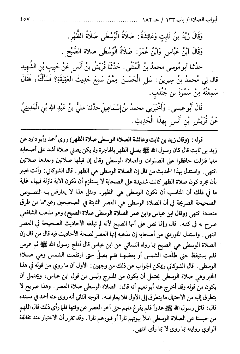 قَالَ الشَّوْكَانِيُّ وَأَنْتَ خَبِيرٌ بِأَنَّ مُجَرَّدَ كَوْنِ صَلَاةِ الظُّهْرِ كَانَتْ شَدِيدَةً عَلَى الصَّحَابَةِ لَا يَسْتَلْزِمُ أَنْ تَكُونَ الْآيَةُ نَازِلَةً فِيهَا غَايَةُ مَا فِي ذَلِكَ أَنَّ الْمُنَاسِبَ أَنْ تَكُونَ الْوُسْطَى هِيَ الظُّهْرُ وَمِثْلُ هَذَا لَا يُعَارَضُ بِهِ النُّصُوصُ الصَّحِيحَةُ الصَّرِيحَةُ فِي أَنَّ الصَّلَاةَ الْوُسْطَى هِيَ الْعَصْرُ الثَّابِتَةُ فِي الصَّحِيحَيْنِ وَغَيْرِهِمَا مِنْ طُرُقٍ مُتَعَدِّدَةٍ انْتَهَى (وقال بن عباس وبن عُمَرَ الصَّلَاةُ الْوُسْطَى صَلَاةُ الصُّبْحِ) وَهُوَ مَذْهَبُ الشَّافِعِيِّ صَرَّحَ بِهِ فِي كُتُبِهِ