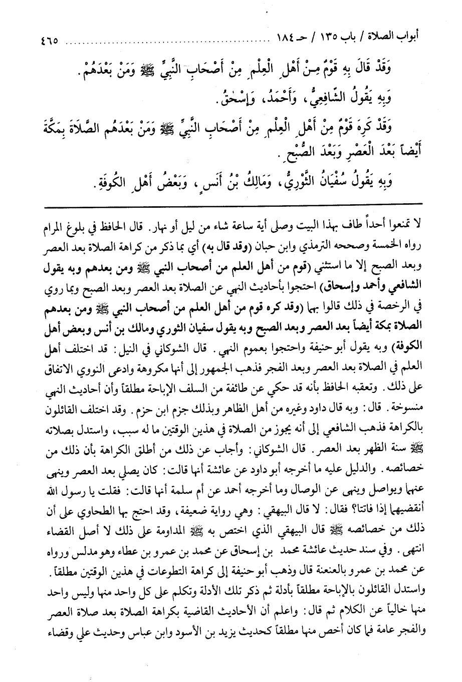 قَالَ الْحَافِظُ فِي بُلُوغِ الْمَرَامِ رَوَاهُ الْخَمْسَةُ وصححه الترمذي وبن حِبَّانَ (وَقَدْ قَالَ بِهِ) أَيْ بِمَا ذُكِرَ مِنْ كَرَاهَةِ الصَّلَاةِ بَعْدَ الْعَصْرِ وَبَعْدَ الصُّبْحِ إِلَّا مَا اسْتُثْنِيَ (قَوْمٌ مِنْ أَهْلِ الْعِلْمِ مِنْ أَصْحَابِ النَّبِيِّ صَلَّى اللَّهُ عَلَيْهِ وَسَلَّمَ وَمَنْ بَعْدَهُمْ وَبِهِ يَقُولُ الشَّافِعِيُّ وَأَحْمَدُ وَإِسْحَاقُ) احْتَجُّوا بِأَحَادِيثِ النَّهْيِ عَنِ الصَّلَاةِ بَعْدَ الْعَصْرِ وَبَعْدَ الصُّبْحِ وَبِمَا رُوِيَ فِي الرُّخْصَةِ فِي ذَلِكَ قَالُوا بِهِمَا (وَقَدْ كَرِهَ قَوْمٌ مِنْ أَهْلِ الْعِلْمِ مِنْ أَصْحَابِ النَّبِيِّ صَلَّى اللَّهُ عَلَيْهِ وَسَلَّمَ وَمَنْ بَعْدَهُمُ الصَّلَاةَ بِمَكَّةَ أَيْضًا بَعْدَ الْعَصْرِ وَبَعْدَ الصُّبْحِ وَبِهِ يَقُولُ سُفْيَانُ الثَّوْرِيُّ وَمَالِكُ بْنُ أَنَسٍ وَبَعْضُ أَهْلِ الْكُوفَةِ) وَبِهِ يَقُولُ أَبُو حَنِيفَةَ وَاحْتَجُّوا بِعُمُومِ النَّهْيِ