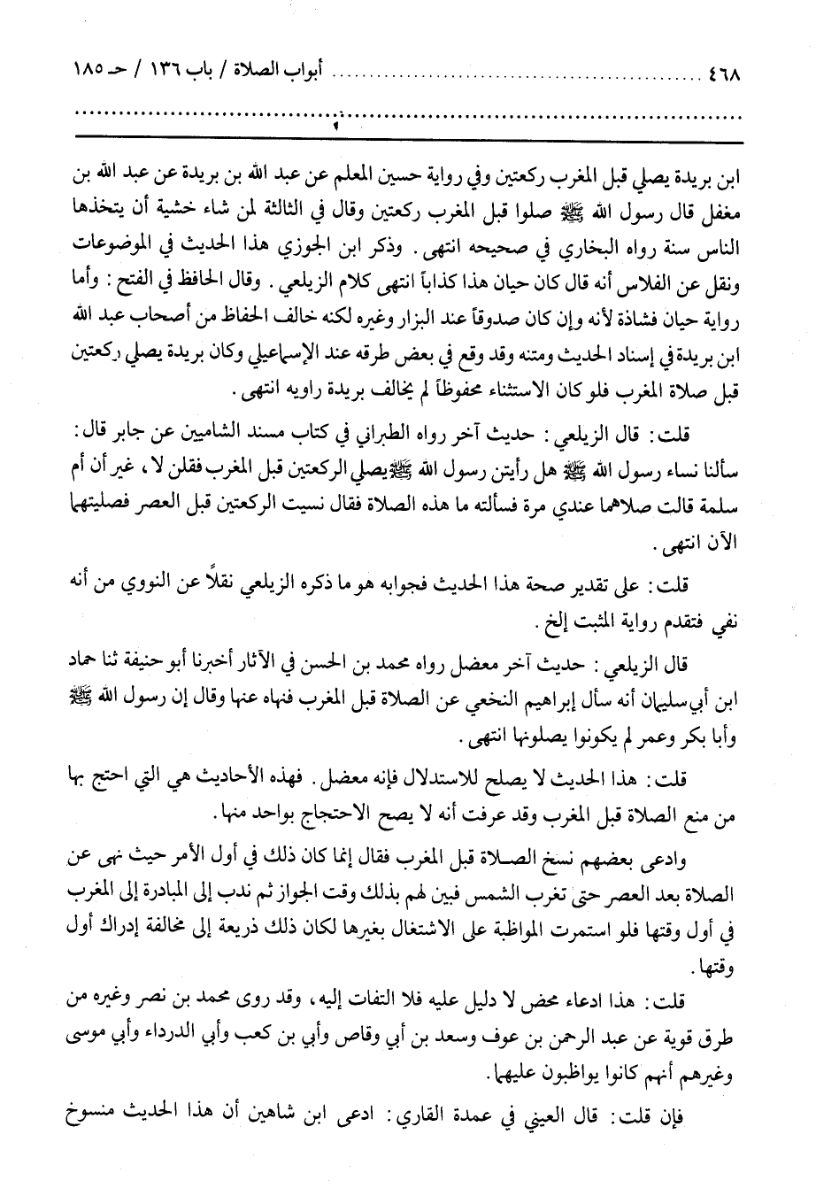 قَالَ الزَّيْلَعِيُّ حَدِيثٌ آخَرُ مُعْضَلٌ رَوَاهُ مُحَمَّدُ بْنُ الْحَسَنِ فِي الْآثَارِ أَخْبَرَنَا أَبُو حَنِيفَةَ ثَنَا حَمَّادُ بْنُ أَبِي سُلَيْمَانَ أَنَّهُ سَأَلَ إِبْرَاهِيمَ النَّخَعِيَّ عَنِ الصَّلَاةِ قَبْلَ الْمَغْرِبِ فَنَهَاهُ عَنْهَا وَقَالَ إِنَّ رَسُولَ اللَّهِ صَلَّى اللَّهُ عَلَيْهِ وسلم وَأَبَا بَكْرٍ وَعُمَرَ لَمْ يَكُونُوا يُصَلُّونَهَا انْتَهَى