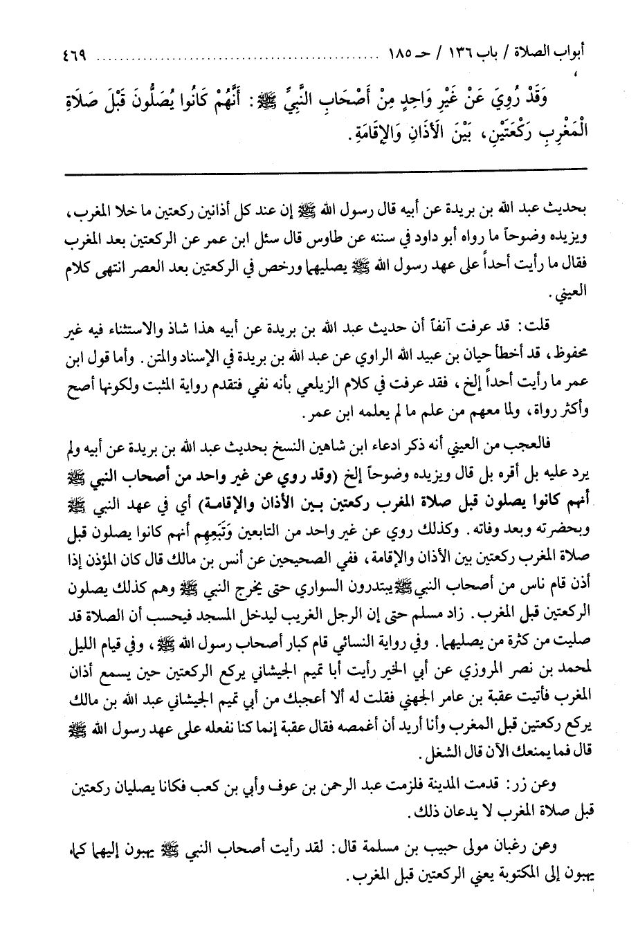 بِحَدِيثِ عَبْدِ اللَّهِ بْنِ بُرَيْدَةَ عَنْ أَبِيهِ قَالَ رَسُولُ اللَّهِ صَلَّى اللَّهُ عَلَيْهِ وَسَلَّمَ إِنَّ عِنْدَ كُلِّ أَذَانَيْنِ رَكْعَتَيْنِ مَا خَلَا الْمَغْرِبَ وَيَزِيدُهُ وُضُوحًا مَا رَوَاهُ أَبُو دَاوُدَ فِي سُنَنِهِ عَنْ طاوس قال سئل بن عُمَرَ عَنِ الرَّكْعَتَيْنِ بَعْدَ الْمَغْرِبِ فَقَالَ مَا رَأَيْتُ أَحَدًا عَلَى عَهْدِ رَسُولِ اللَّهِ صَلَّى اللَّهُ عَلَيْهِ وَسَلَّمَ يُصَلِّيهِمَا وَرَخَّصَ فِي الرَّكْعَتَيْنِ بَعْدَ الْعَصْرِ انْتَهَى كَلَامُ الْعَيْنِيِّ